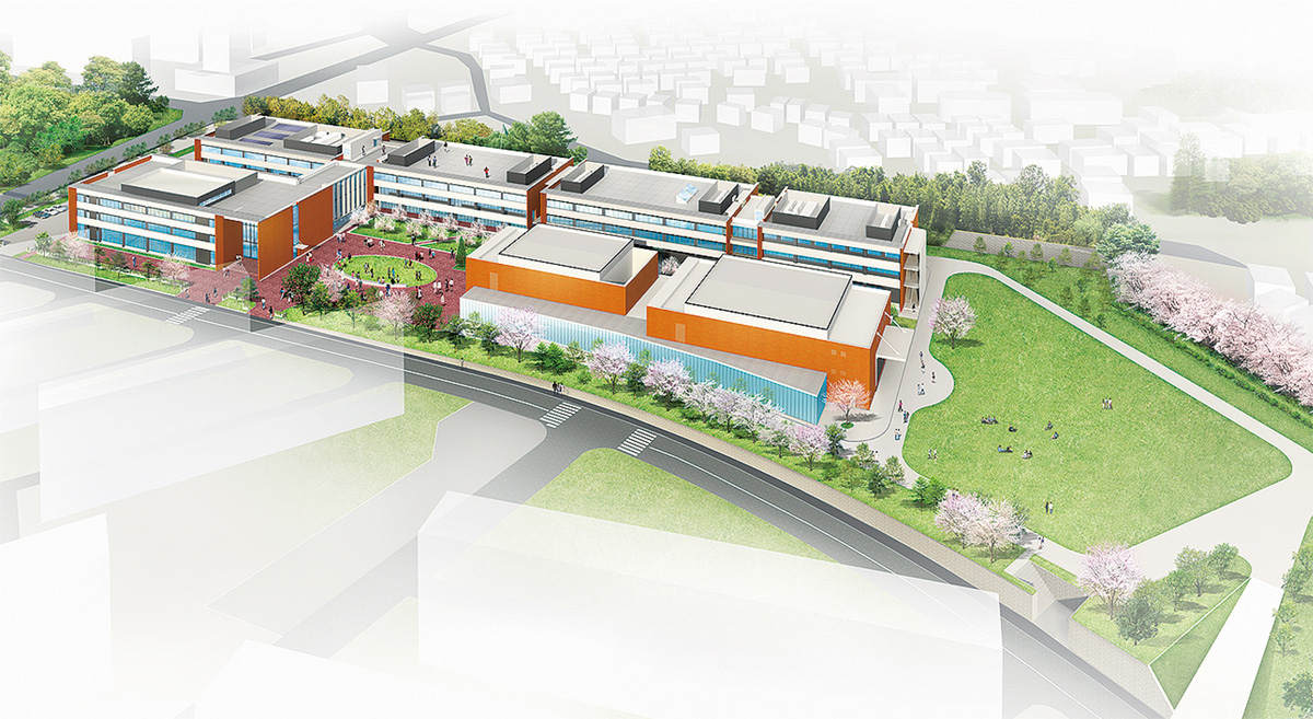 芝生広場を中心に東西に伸びやかに広がる3階建ての校舎を配置。地域に開かれた中央広場、東側広場を計画しており、地域活性化の起点となる新たな街並みが形成される。隣接する山崎団地地区の高齢化・過疎化が課題となるなか、佐藤理事長は「新キャンパスが建ち、学生が集まることでこの地域の活性化に繋がれば嬉しい」と話し、同大学の畑山浩昭学長は「単に施設の開放という事だけでなく、地域連携プログラム等を通じて、人と人との交わりを作っていければ」と話した。