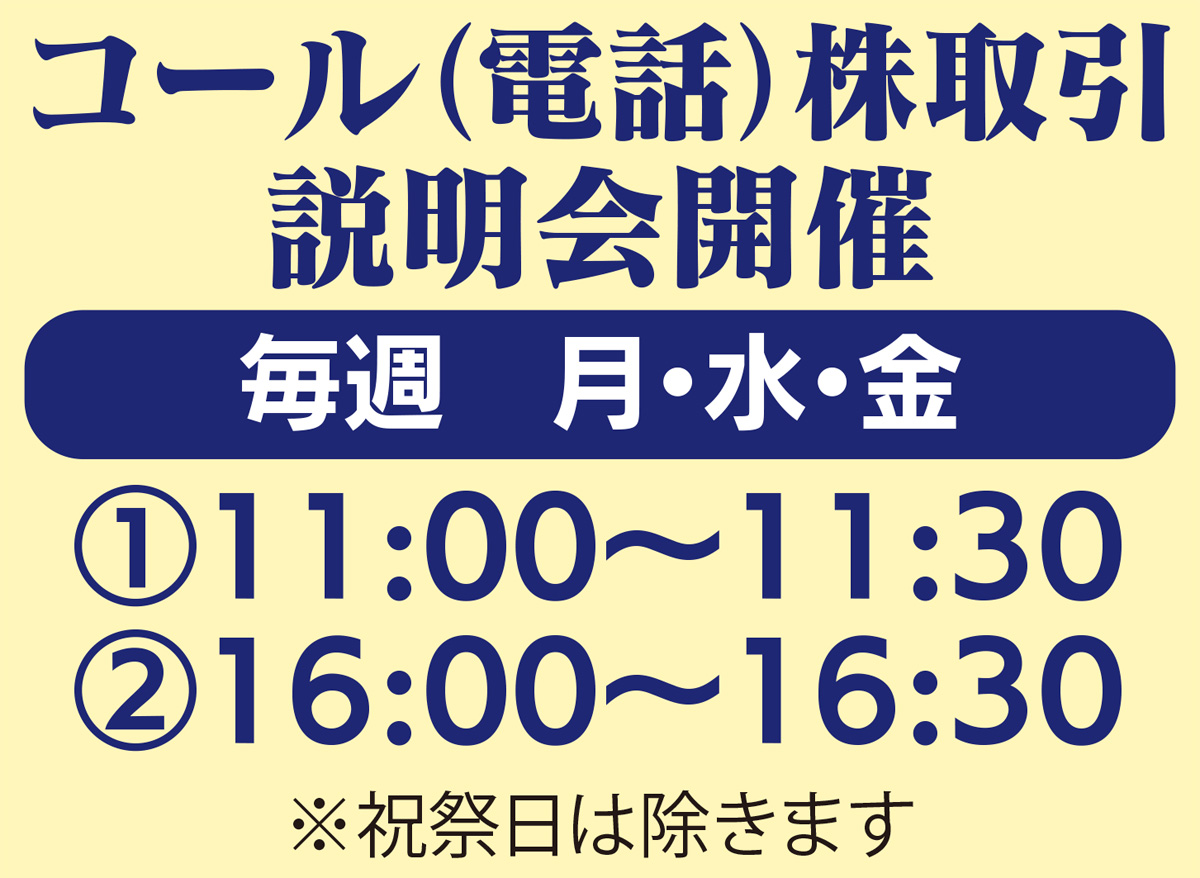 コールセンターのオペレーターが注文を受付けるので、パソコンを使用しなくてもネット並みの売買コストになり大変お得!もちろんインターネットでも取引可能。パソコンが苦手でも店頭でスタッフが操作方法を案内してくれるから安心だ。