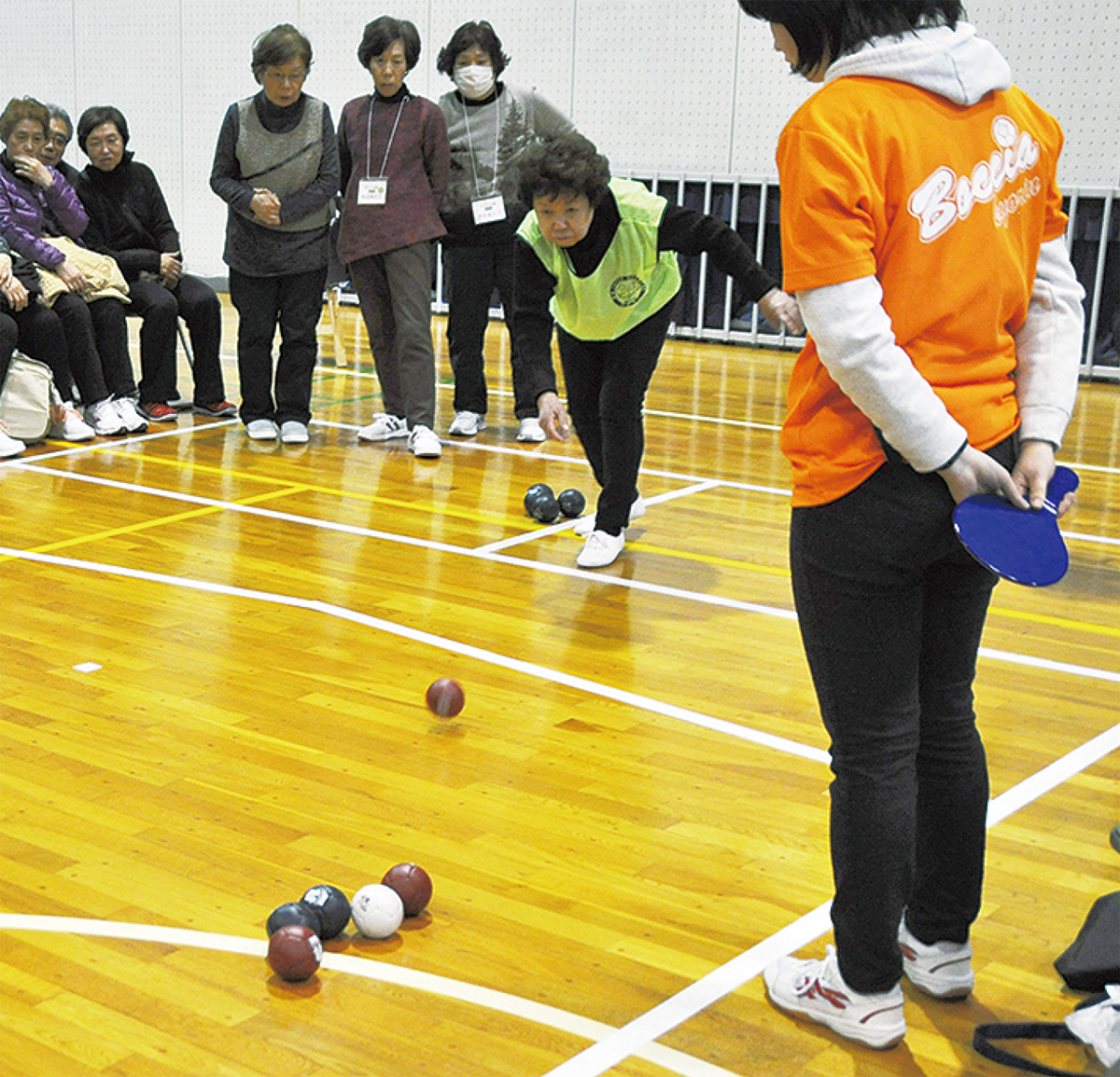 鶴川女子短期大学の体育館を会場に2日、日本で初めての「ボッチャ」のシニア大会が開かれた。主催は日刊スポーツ新聞社と社会福祉法人悠々会。ボッチャは、ジャックボール(目標球)という白いボールに、赤・青のそれぞれ6球ずつのボールをいかに近づけるかを競うスポーツ。