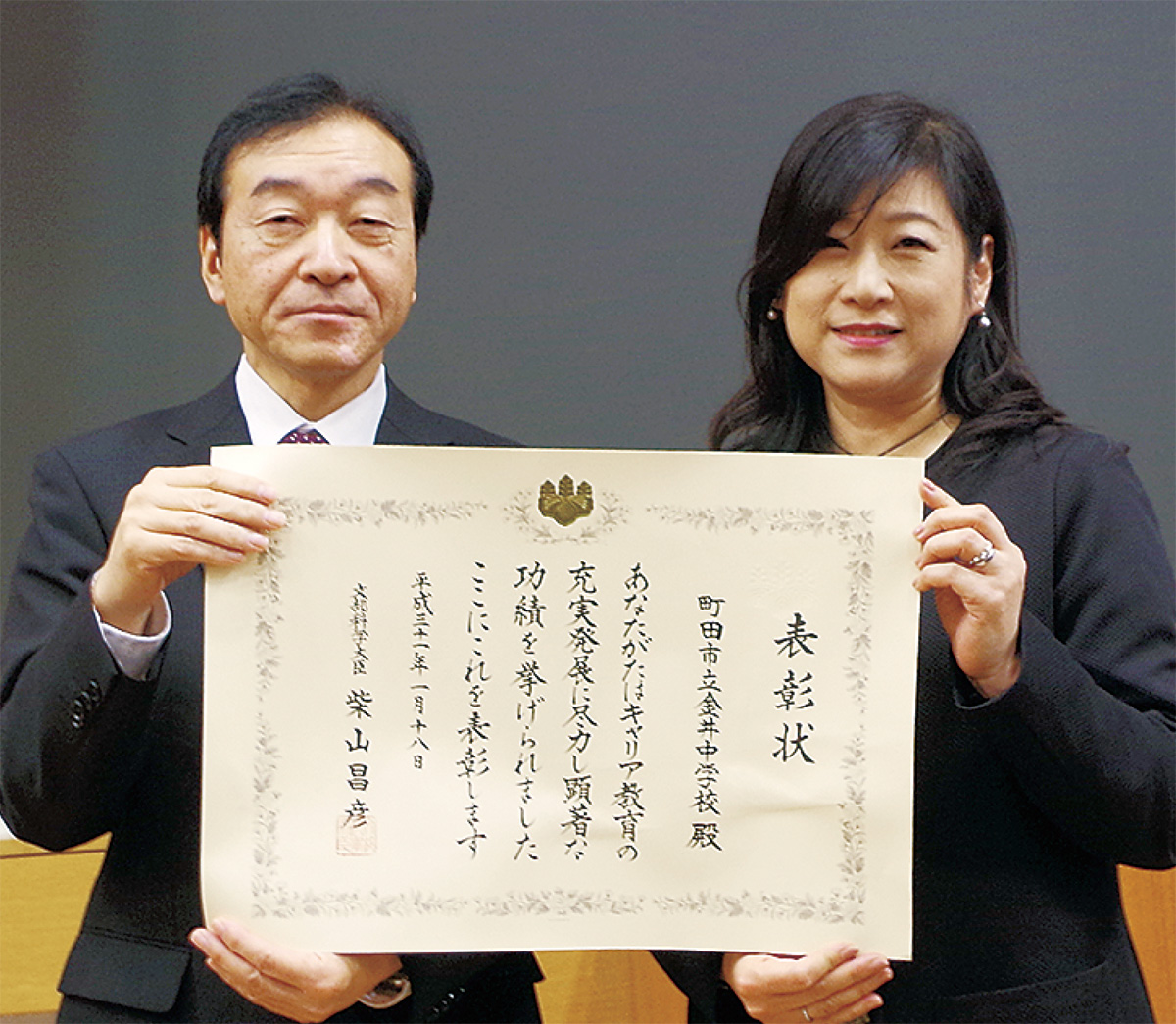 地域の町内会などと連携し、職場体験や着付け教室、職業についての話を聞くなどのキャリア教室に力を入れる市立金井中学校(仙北屋正樹校長=人物風土記で紹介)の取組みが、文部科学省主催の「第12回キャリア教育優良教育委員会、学校及びPTA団体等文部科学大臣表彰」を受賞し、1月18日に表彰された。