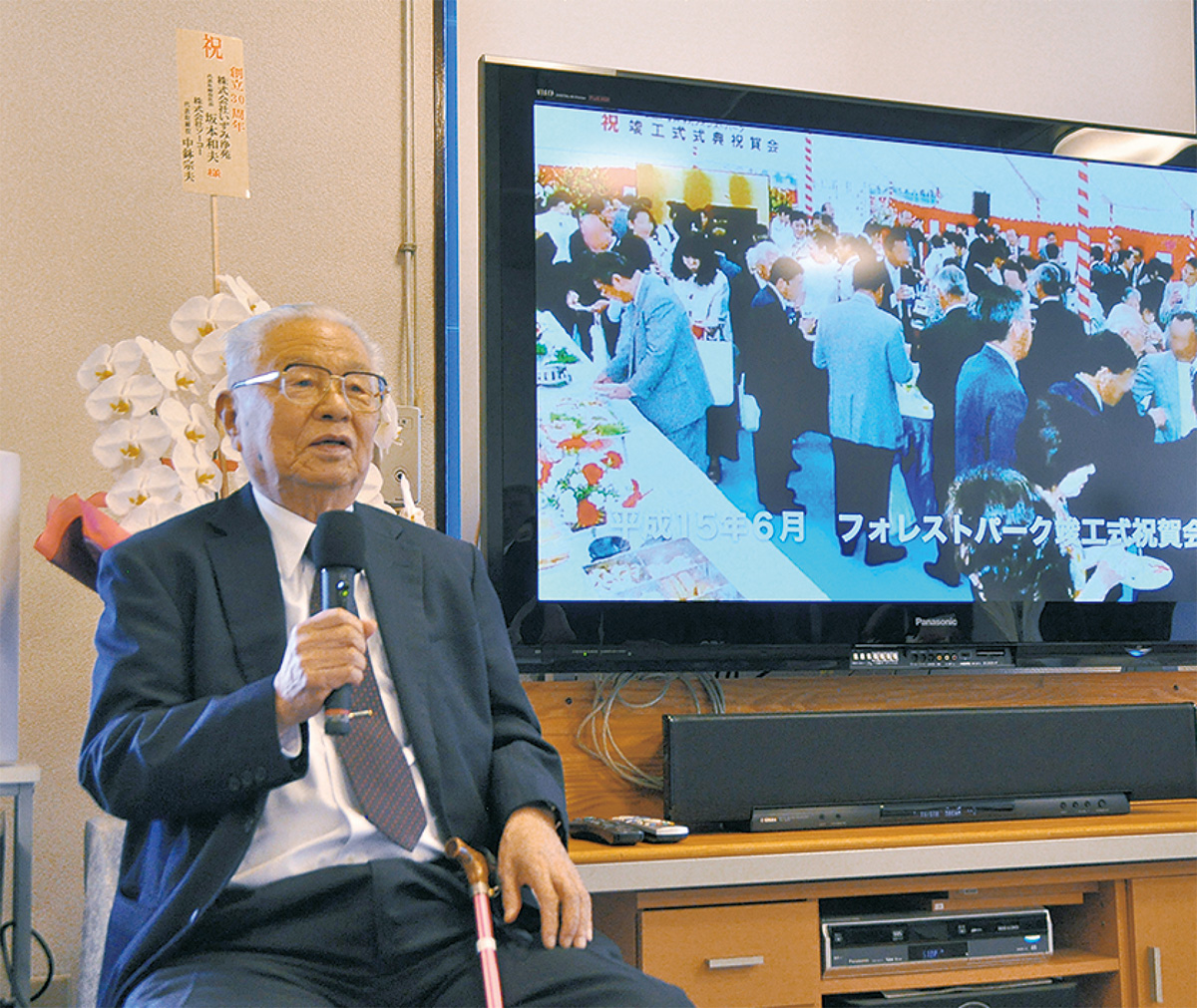 創業者の坂本義雄会長は、土地開発など創業当時の苦労話や、今では同苑の代名詞となっている「樹木葬墓苑」開発のいきさつや思いを話した。また30年間を振り返り、関わる周りの人々への感謝を述べた。