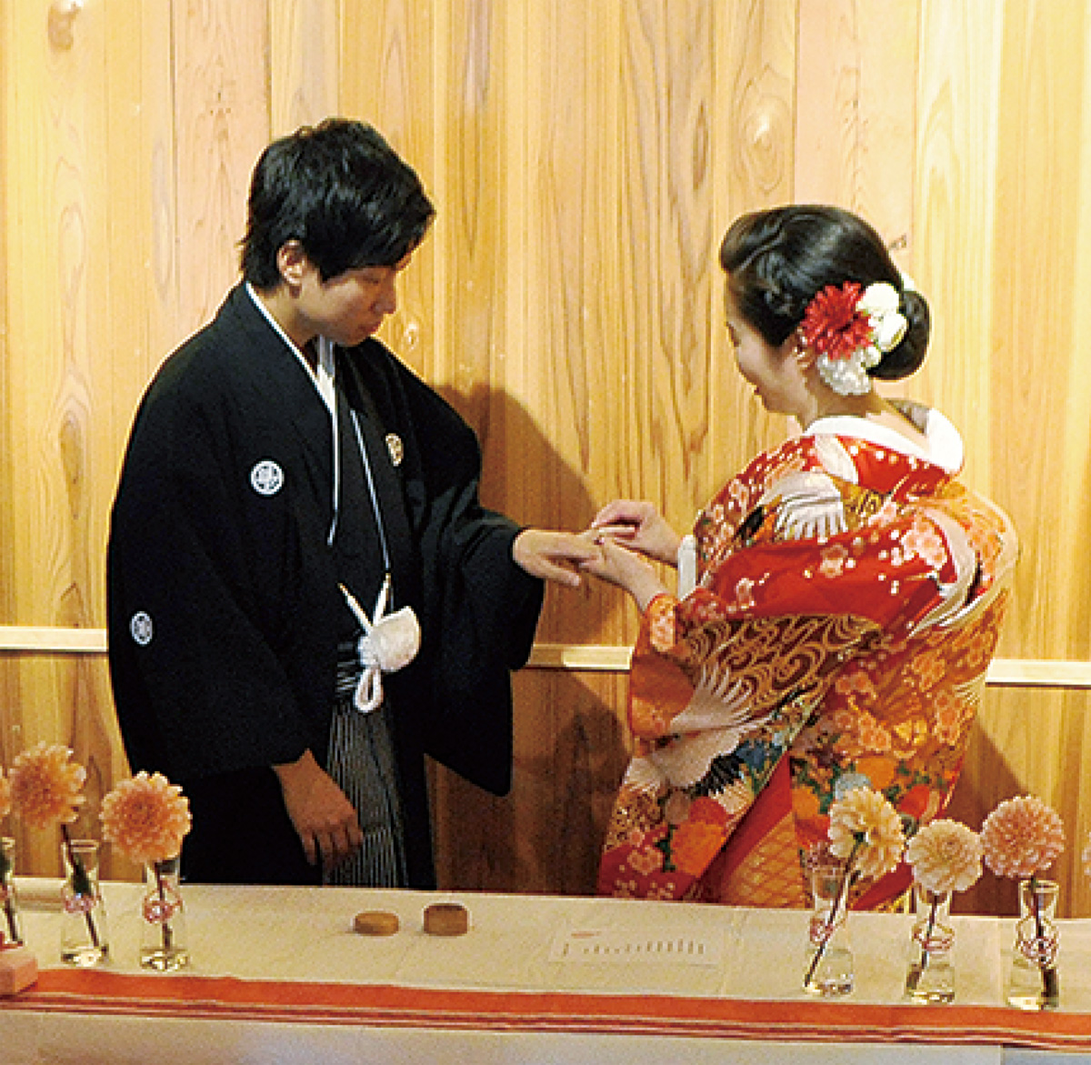 先日来館者が20万人を超えた小野路宿里山交流館で8日、地元・町田を生かした結婚式を企画するタエコーポレーションのプロデュースにより、高木風里(ふさと)さんと高井祥子さんの人前和婚式が挙げられた。親族や友人らが集まり、二人の門出を盛大に祝った。山崎凱史館長は「楽しい時も苦しい時も、二人で乗り越えていけるようお祈りしています」と祝いの言葉を贈った。