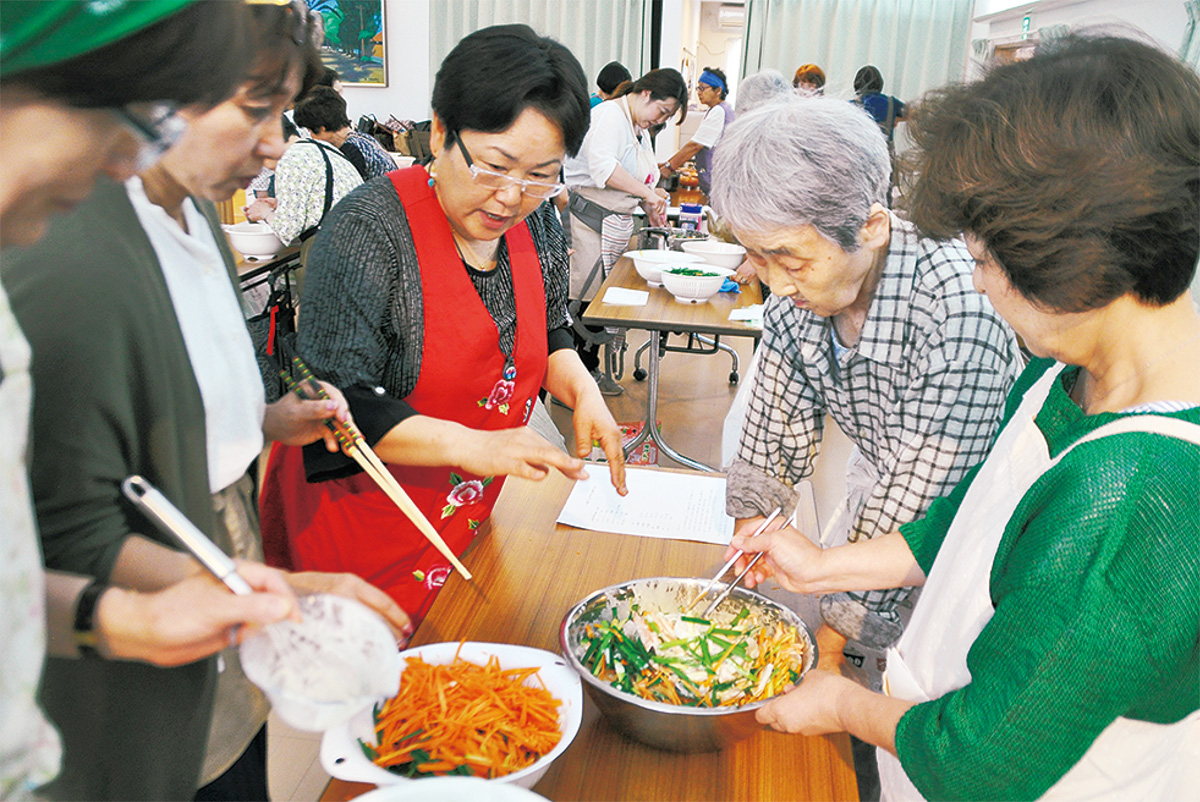 世宗学堂「韓国語講座」の講師を務める尹貞源教授が料理指導し、生徒たち全員でニラやニンジン、エビ、イカなどの食材を切ったり、小麦粉に混ぜ合わせたりして調理した。タネをフライパンで焼き、上手にひっくり返すことができると、歓声が上がるなど、終始和やかな交流となった。その後チヂミやキムチを試食すると「おいしい」「マシッソヨ」などの声が上がった。入居者の柳澤けさほさん(73)は「色んな世代の人たちとおしゃべりできるのが嬉しい」感想を述べた。