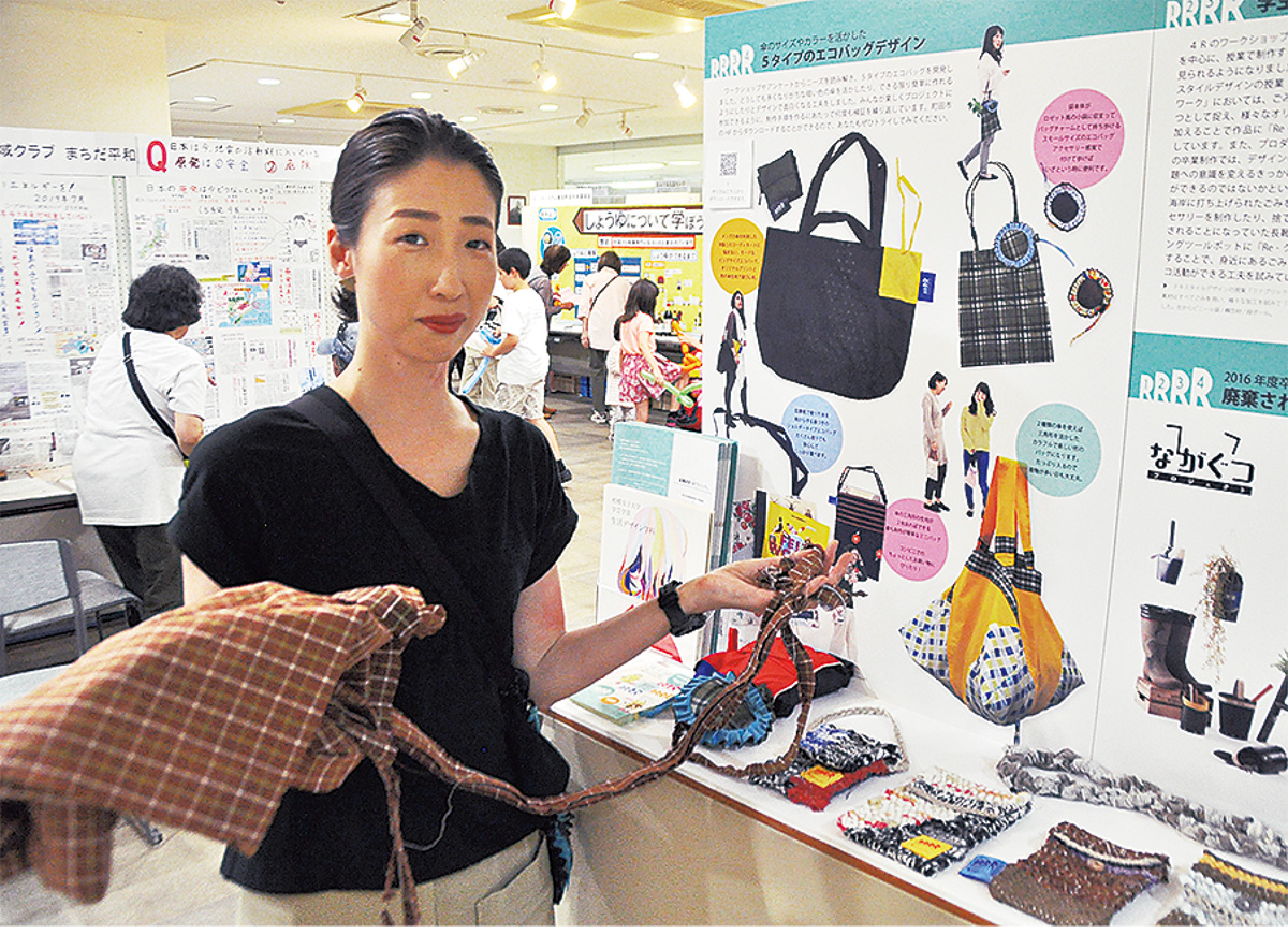 研究発表では傘の生地を使用したエコバックに加えて、布団カバーを素材としたスマホケースを紹介。生活デザイン学科の吉川ちひろ准教授は「生地を手で裂いて紐状にして織る『裂き織り』という昔ながらの手法で作るので、かわいらしく、若い人から年配の人にも好評です。4Rのタグも付けて商品らしくしました。この取組で環境について考える学生が増えてきたのは嬉しい」と話した。