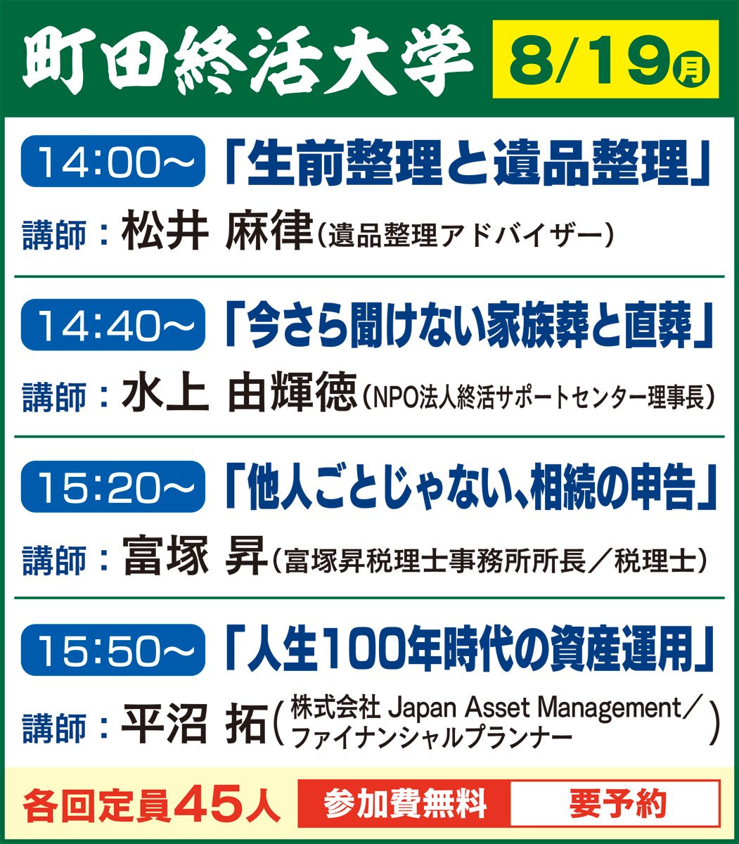 「一日でシニアライフのお悩みをすべて解決」。”終活”のプロたちが様々なテーマで講義をしてくれる参加費無料の講座「町田終活大学」が、町田パリオ(森野1の15の13)5階まちなか会議室で開催される。7月の第1弾が公表後すぐに満席となった好評のイベント。