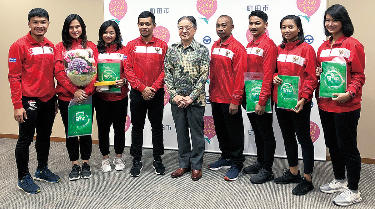 練習は8月27日〜9月3日、サン町田旭体育館を会場に行った。来日した選手は女子組手55kg級で世界ランキング16位のチョック・イストゥリ・アグン・サニスティヤラニ選手ら6人とスタッフ。インドネシアは約500万人の愛好家がいる日本以上の空手大国だ。現地のテレビではJリーグや大相撲中継があるなど、日本を身近に感じている国民も多い。インドネシアの民族衣装バティックを着て代表選手たちを迎えた石阪市長は「ようこそ町田市へ。プレミアリーグで成績を残して、ぜひ東京オリンピックへの出場権を獲得してください」と話した。選手団を代表して挨拶に立ったドニー・ダルマワン女子コーチは「空手を通じて町田に来ることができて嬉しい。プレキャンプ実施にご尽力いただき感謝します」と述べた。