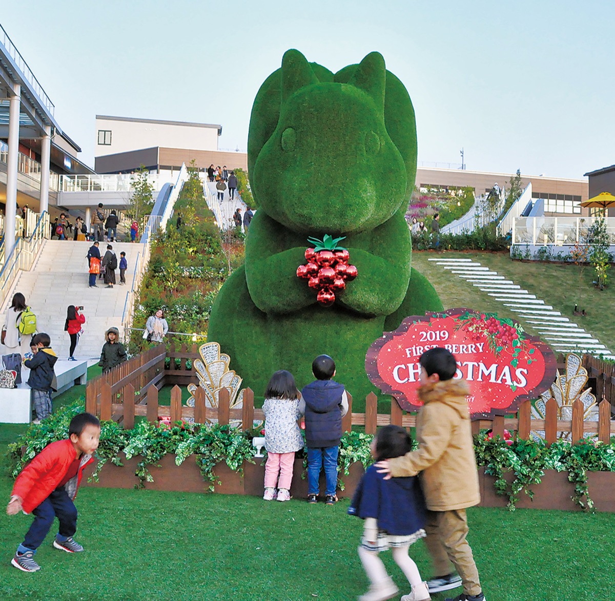 南町田グランベリーパークで11月30日、イルミネーション点灯式が開かれた。今回のイルミネーションの目玉の一つ、高さ5mの人工芝で作られた町田リス園(樋口健治園長)が監修したリスも同施設のパークプラザにお披露目された。