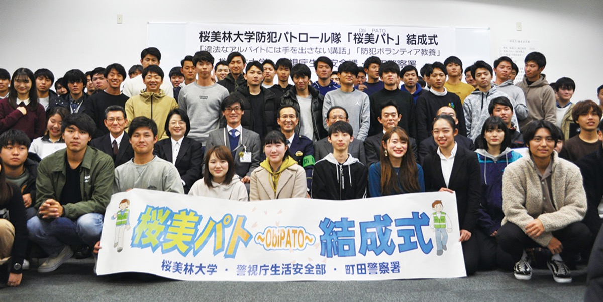 同大学で行われた結成式では署員による講話や心構えなどの指導教養が行われ、その後、町田駅周辺に移動し、パトロールを実施。「悪質な客引きやスカウト、特殊詐欺の受け子・出し子など、大学生が被害者にも加害者にもなる事案が増えている。自分たちが参加することで、意識を高めてもらえたら」と同署。
