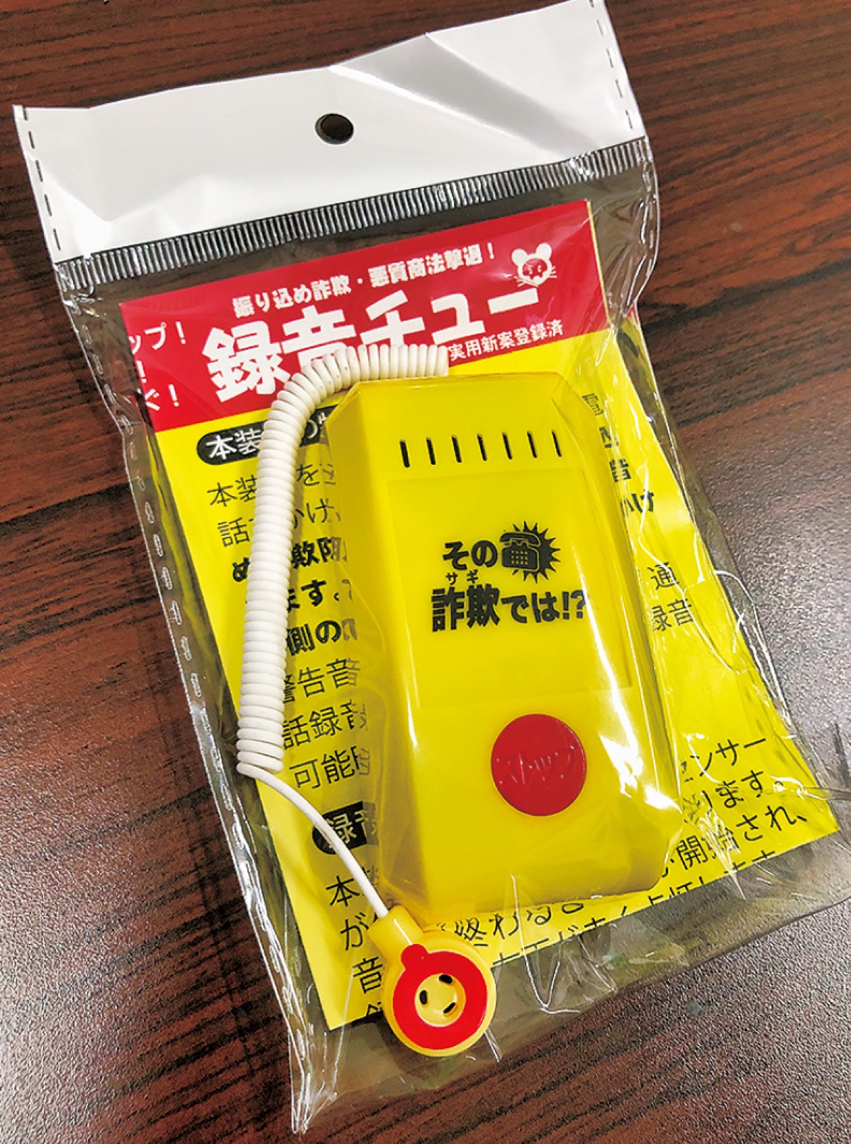 犯人からの電話(アポ電)には、自動通話録音機や迷惑防止機能付き電話機の設置、留守番電話などを利用して、電話に出ないという対策が有効だ。町田署は町田防犯協会、町田警備業連絡協議会と共同で、電話に取り付けるだけで留守電の機能を持つ「録音チュー」=写真=と、玄関などに貼るプレートを配布し、犯罪抑止や被害撲滅の啓発を強化している。