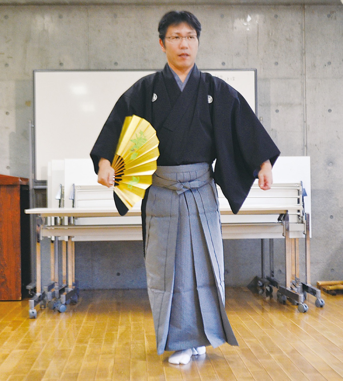 町田市民文学館ことばらんどで11日、親子を対象にした「はじめてのお能体験教室」が行われた。講師は町田市在住のシテ方金春流能楽師、井上貴覚氏=写真。