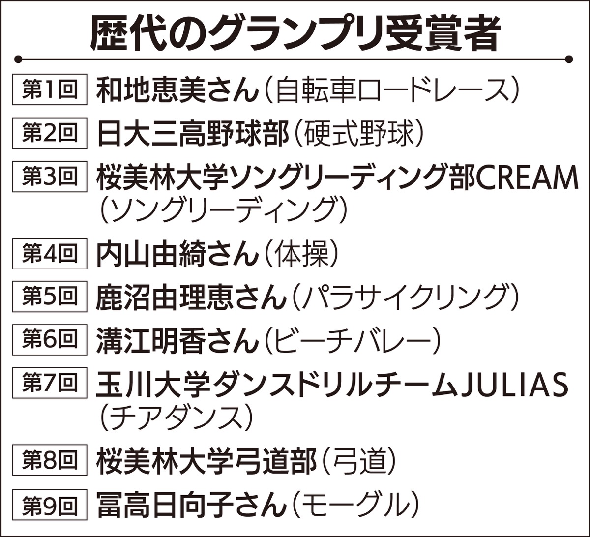 準グランプリにはNHK杯で3位に入った体操の畠田千愛(ちあき)さん(15)が選出。昨年は姉で体操女子日本代表候補の瞳さん(19)が同じ準グランプリを受賞している。「ベストインパクト賞」には第42代日本ライトフライ級王者となったボクシングの高橋悠斗さん(27)が選出。「ベストパフォーマンス賞」にスタンドアップパドルの世界大会で10月に4位、12月に銅メダルと好成績を残した奥秋李果さん(26)と、ライフル射撃の水田光夏(みか)さん(22)。奥秋さんは19年のグローバルアクト賞に続いて連続の受賞。桜美林大学4年の水田さんは東京2020パラリンピック代表選手に内定している。「ベストホープ賞」は全日本ジュニア新体操選手権大会、リボン団体の部で優勝した町田RGが受賞し、6人のメンバーが笑顔を見せた。