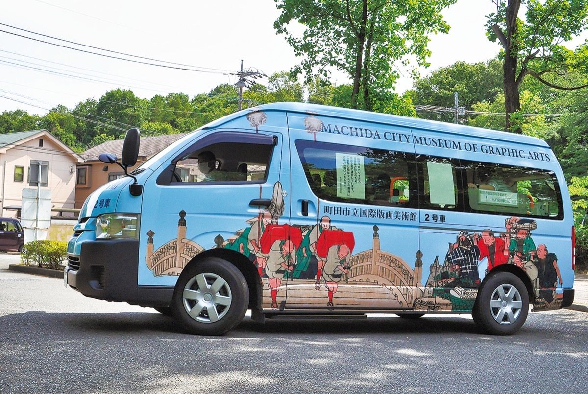 現在、インプリントまちだ展を開催中の国際版画美術館は来館者の「足」となる、無料の送迎バスを運行している。町田駅周辺(原町田大通り)から版画美術館を結ぶルートで20分おきの発着。会期中の土曜、日曜、祝日を中心に運行。新型コロナウイルス感染拡大防止のため、人と人との間隔を取るので定員は5人。
