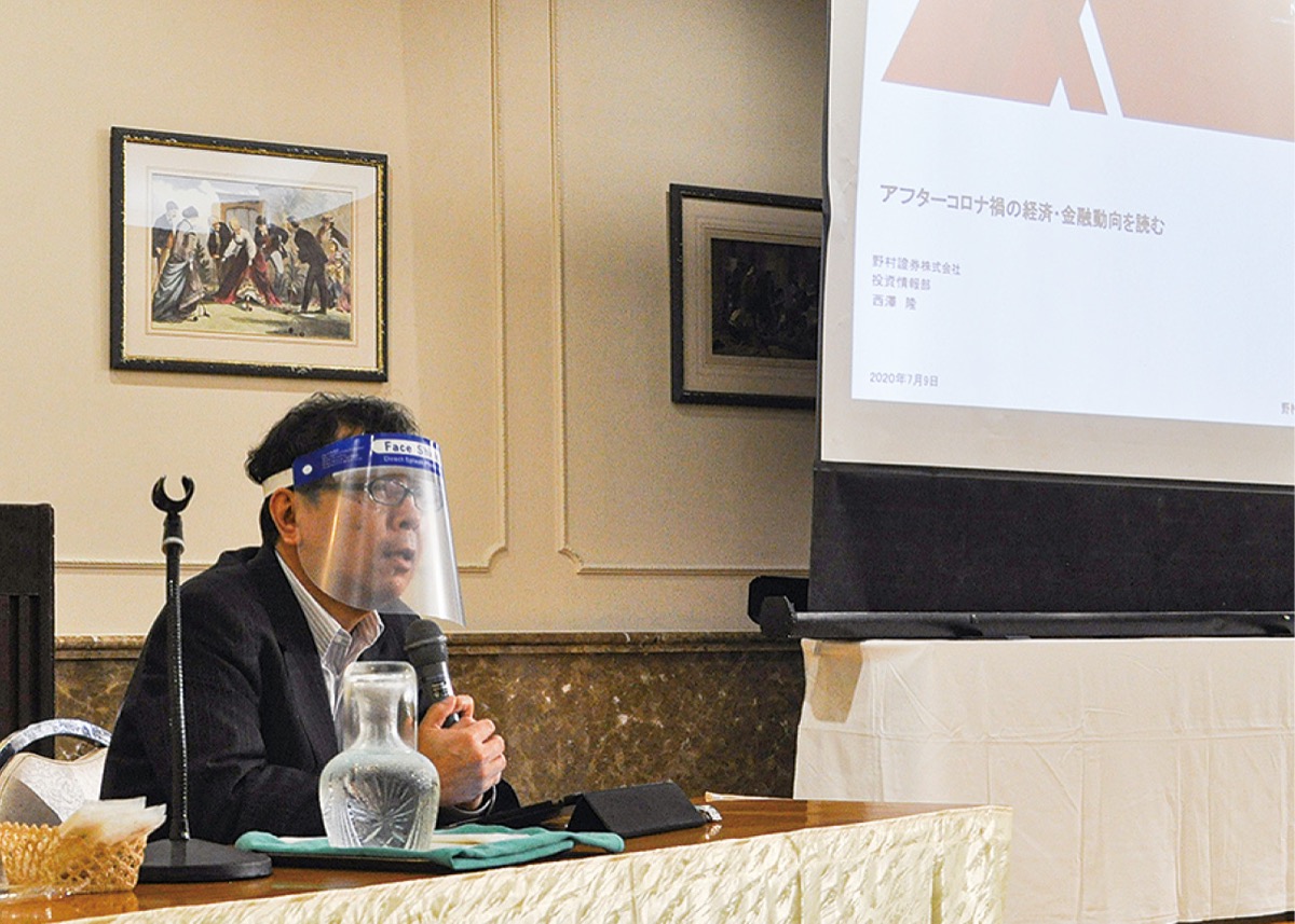 講演会には野村證券(株)投資情報部部長の西澤隆氏が登壇。「アフターコロナ禍の経済・金融動向を読む」をテーマに講演した。日本だけでなくアメリカや中国の現在・過去のデータをもとに「コロナとの共存」について触れ、「新たなビジネスチャンスを生み出している企業」等の具体例や今後予想される社会構造の変化などを解説した。