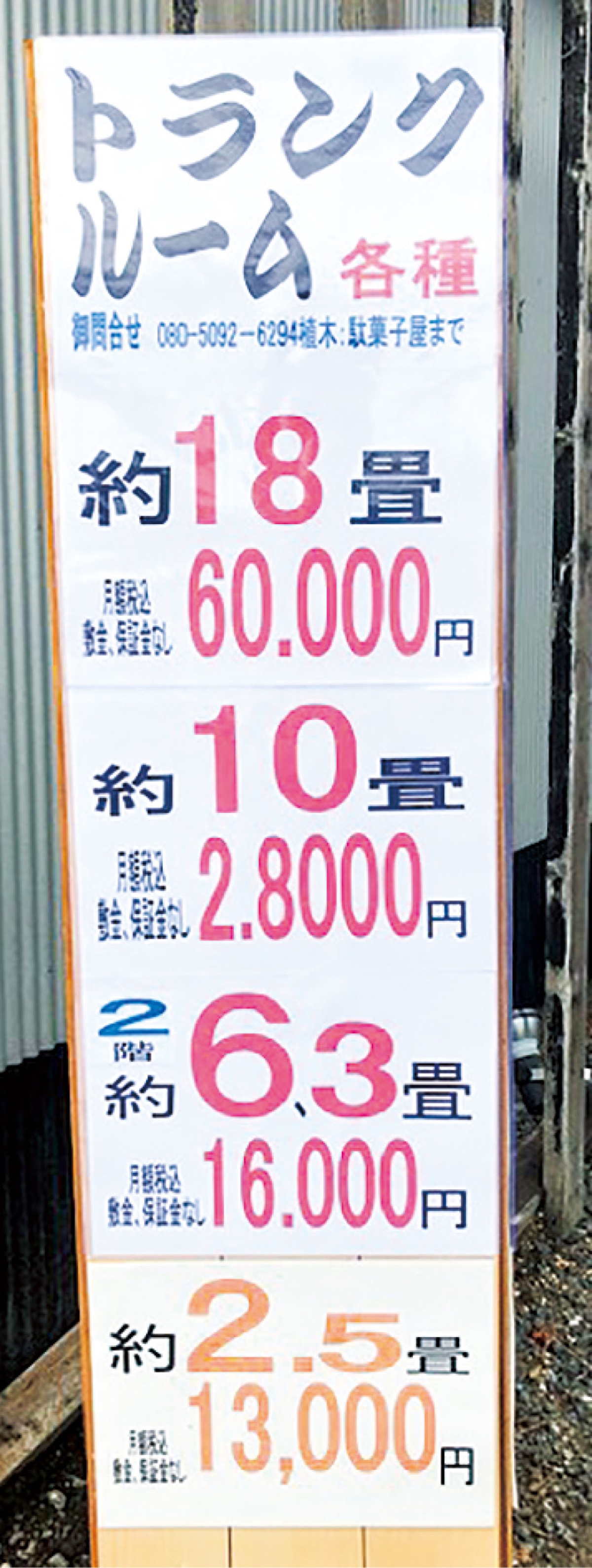 金井地域で15年以上実績。駄菓子屋横のトランクルーム中木屋が倉庫の貸し出しを行っている。
