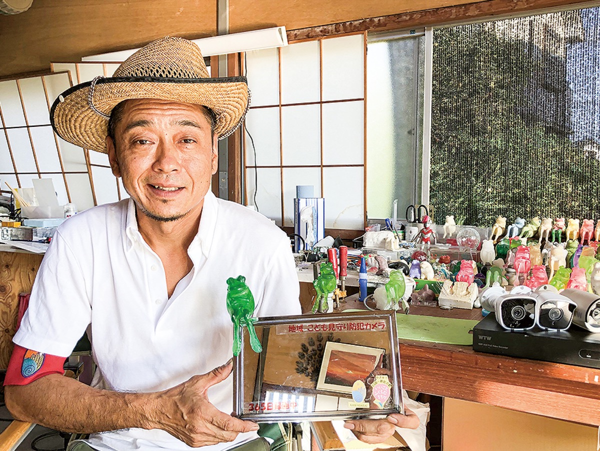 昨年11月、深田理事長は交差点で当て逃げされたが、たまたま通りかかった車のドライブレコーダーの映像が証拠になり犯人を捕まえることができた。「映像を残すことが防犯につながるという意識が芽生えた」と話す。また、カメラの設置が抑制にもなるという専門家の話も取り入れた。見守り用カメラの前には注意喚起と録画している旨の表示を掲げる。人が鏡に目線を向けるという心理を応用し、警告板は鏡にした。警告板の上には「ケロちゃん」と名付けたオリジナルのカエルの人形が座る。「地域を見守り、安全に帰る」という思いに引っ掛けた。カエルはLEDが点滅し夜間でも目立つものと、無着色の2つのタイプを用意。「着色は子どもたちの手で行い、防犯との関りを楽しんでもらいたい」。作成は将来的に障害者施設等に依頼し、雇用を生み出したいという思いもある。
