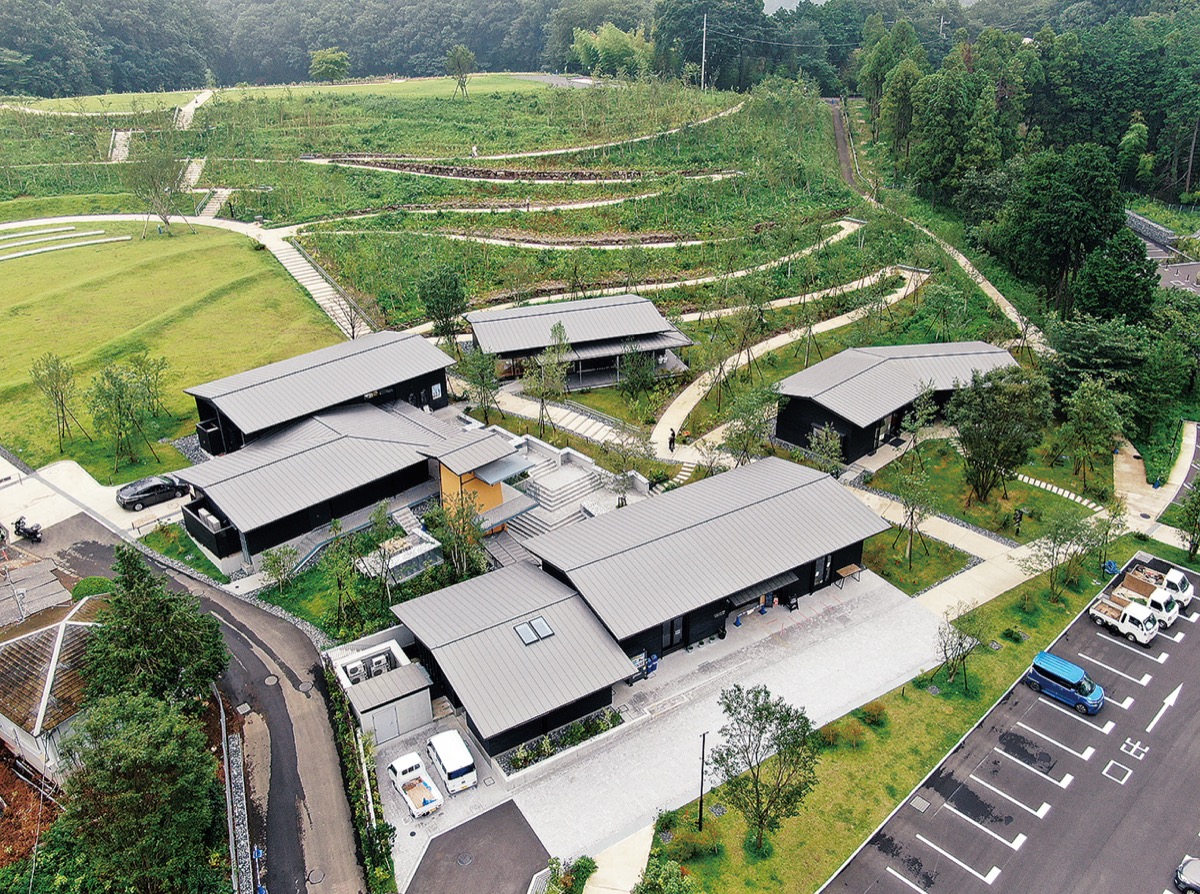 評価のポイントなったのが、プランディング・建築設計・ランドスケープが連携し、使い方と形の一貫性を大切にしたプロセス。また、斜面地に寄り添った分棟型の木造建物と空間、かつてはいたるところで見られた風景としての雑木林の再生も高評価につながった。上空から見ると、丘陵地を活かして大きな造成を避け、建物を地形に沿わせてボリュームを抑えた様子がわかる。さらに既存の農道や生活道を残し、斜面地の園路には手すりを設けずに緩やかな勾配となるよう工夫されている。審査員は「大地の起伏に対するデザイン、細かい工夫が空間の質を高めている」とコメントしている。