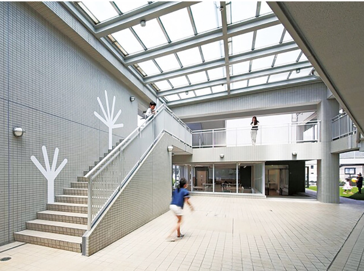 もう一方の「まちのもり本町田」=下写真=は、築27年の独身寮の建物を豊かな共有スペースを持つ賃貸共同住宅へと改修し、コレクティブハウスとコモン付賃貸住宅を複合させた賃貸住宅。単に共用部が充実する改修ではなく、居住者が組合をつくり主体的に暮らしを運営する「コレクティブハウス」を核にすることで建物内部のコミュニティだけでなく、地域の町内会、NPOや地域包括支援センターなどとの関わりを含めてデザインし、それらを実現する試みが高く評価された。「様々なライフスタイル、ライフステージを持つ人々が共に暮らし、生活の中で様々な助け合いを実現しています。これからの住まいの選択肢として加えていただければ」とNPOコレクティブハウジング社代表理事の宮本諭氏。同施設は同時に「キッズデザイン賞」の優秀賞・少子化対策大臣賞も受賞した。