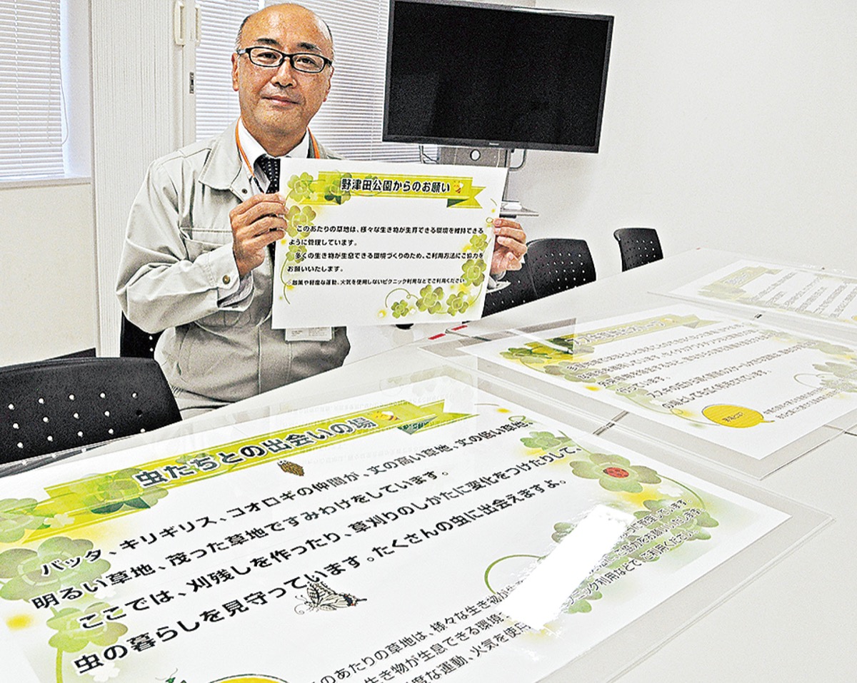 子ども向けの看板も作られ、虫たちが丈の低い草地や高い草地等に棲み分けしていることや、虫が暮らしやすいように刈残しを作っていることなどの説明を分かりやすく紹介。別途、注意喚起の看板も設置する。石川所長は「スポーツ利用と共に様々な自然環境もお楽しみ頂けたら」と話す。