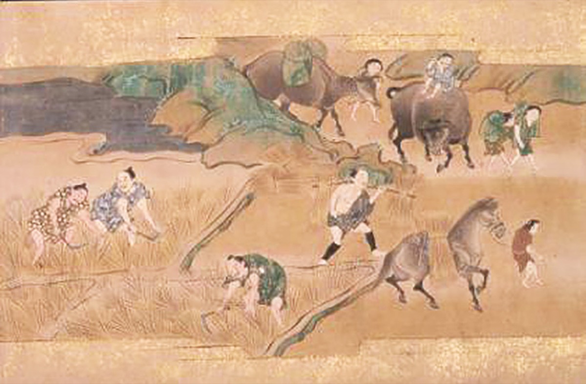 「たはらかさね耕作絵巻」とは江戸時代に上流階級の子どもたちに農業の大変さについて教えるために描かれた教育用の絵巻物で、同館に所蔵されている絵巻の絵図部分を写真パネル化した11枚を紹介する。