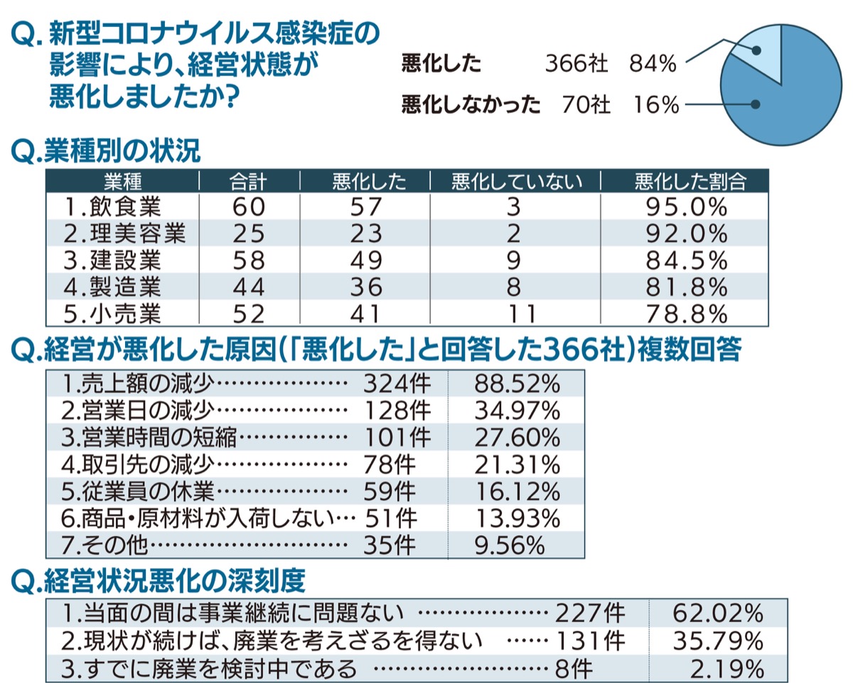 新型コロナの影響により経営状態が悪化したかの質問には、366社(84%)が「悪化した」と回答し、「悪化しなかった」と答えたのは70社(16%)にとどまった。また、「悪化した」と回答した366社に原因を聞くと「売上高の減少」が89%と一番多く、次いで「営業日の減少」35%、「 営業時間の短縮」28%と続く。