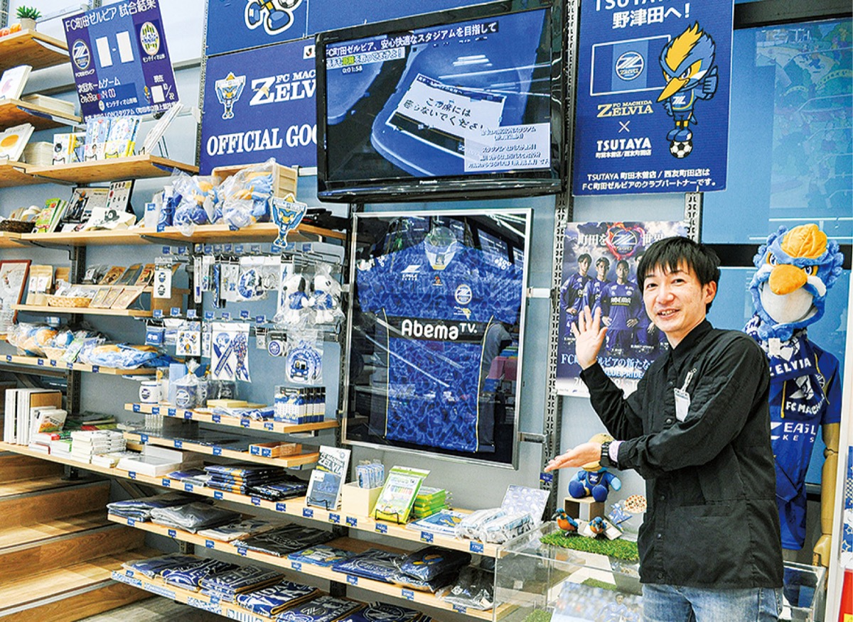 店舗入口付近に約30種類のゼルビアグッズを揃えたコーナーを設けているTSUTAYA町田木曽店(木曽西1の17の13)。2018年の店舗リニューアルの際に設置され、以来グッズやサッカー関連書籍などの販売のほか、モニターで紹介動画を流し、試合結果・予定のパネルを掲示。ゼルビアファンはもちろん、そうでない人にもゼルビアの魅力を伝える面で一翼を担う。
