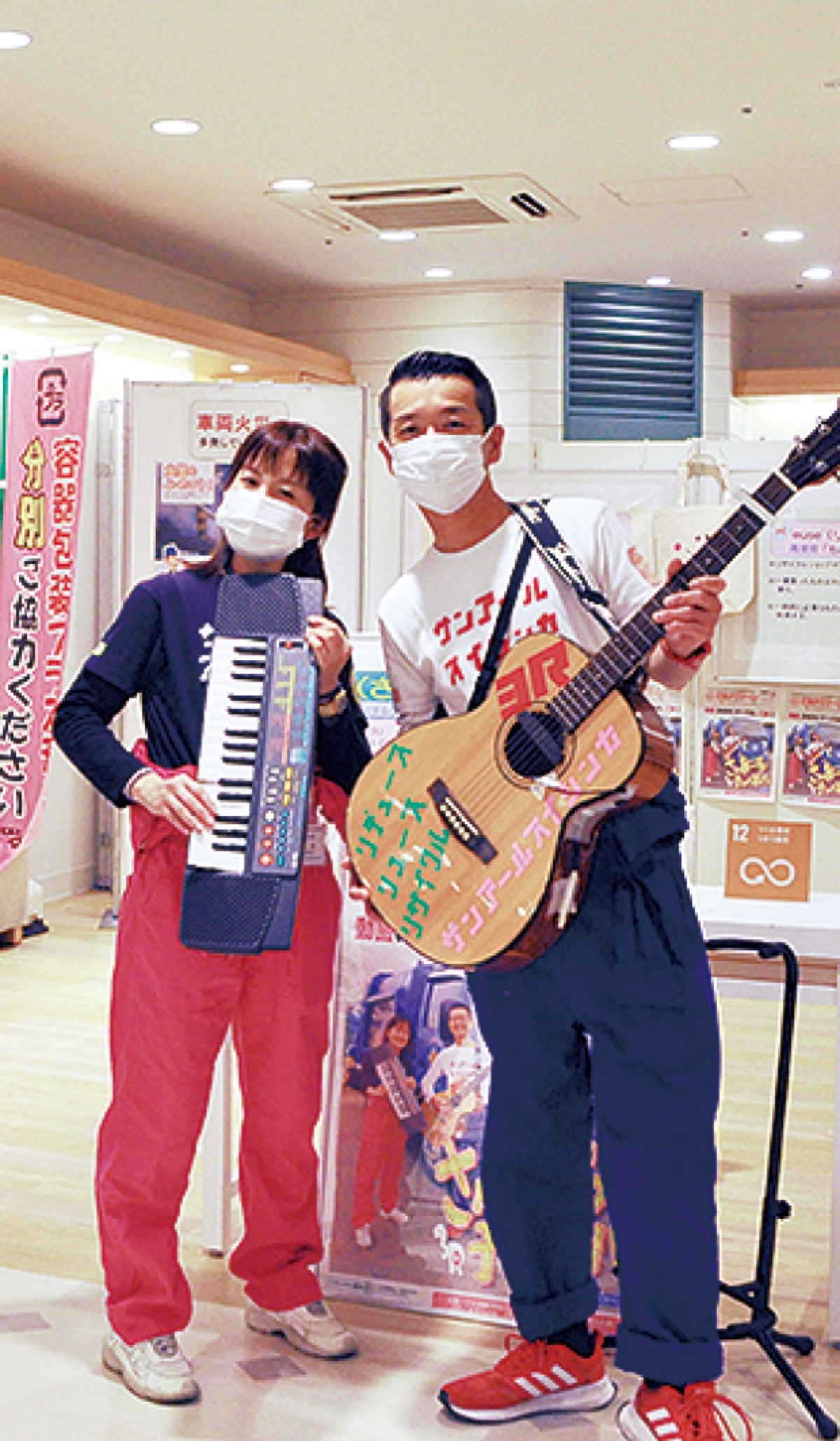展示ブースの一つ「ごみを減らそう相談窓口」に3月9日、3R推進課の職員で、ごみと環境の出張講座や動画配信で子ども達にも人気の「うまちゃん&ゆうちゃん」=写真が登場し、SDGsの目標12「つくる責任つかう責任」に当てはまる3R(リデュース・リユース・リサイクル)の大切さをPRした。期間中2人は不定期で参加する。