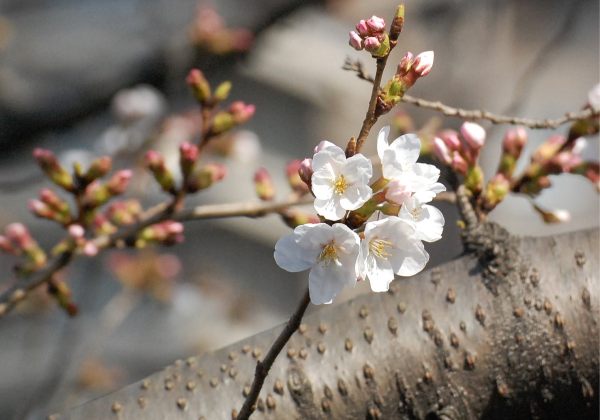 町田総合体育館側を流れる恩田川沿いに咲く桜も宣言通りに開花した(3月19日撮影)。