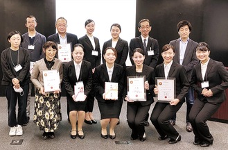 大賞に選ばれた相模女子大学(寺岡夏鈴さん・藤間彩依さん・光籐映子さん・加門由麗さん)をはじめ、各賞の受賞者が集い、改めて喜びを噛み締めた。表彰状を受け取った寺岡さんらは「ゼミ活動もできない中、みんなで力を合わせて最高の結果を残すことができて嬉しい」と喜んだ。式の後は、テーマを提供した応募企業と交流した。