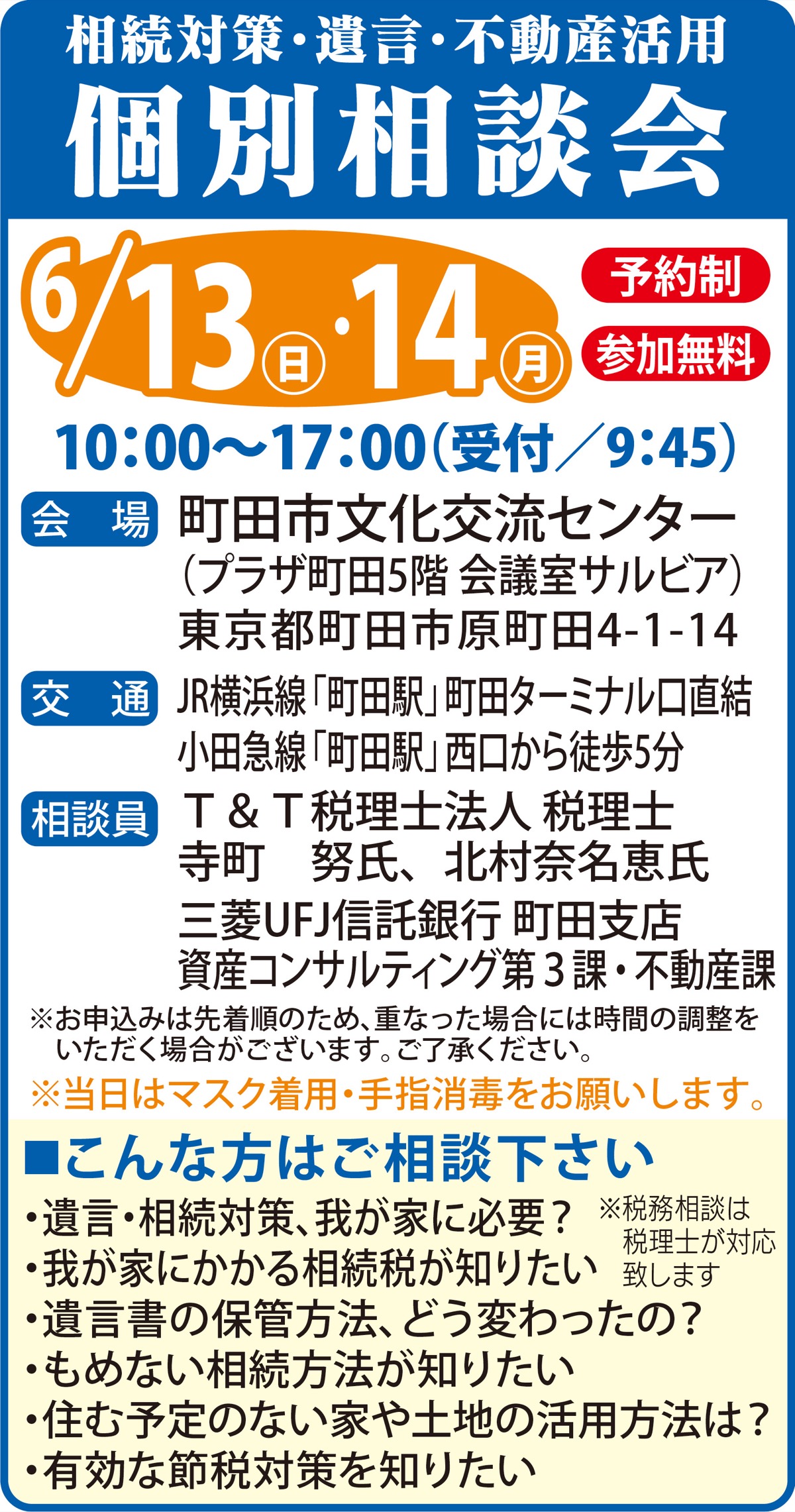 「わが家に相続税はかかるの?」「遺言や相続対策は必要?」などの疑問や遺言書の書き方、保管方法、不動産の分割や節税対策、空き家の賢い活用方法など気軽に相談できるチャンス。予約制のため希望者は左記へ。