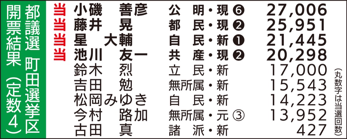 任期満了に伴う東京都議会選挙は7月4日、投開票が行われ、町田市選挙区(定数4)では公明党の小磯善彦氏が2万7千6票を獲得しトップで当選。都民ファーストの会の藤井晃氏、自由民主党の星大輔氏、日本共産党の池川友一氏が議席を確保した。
