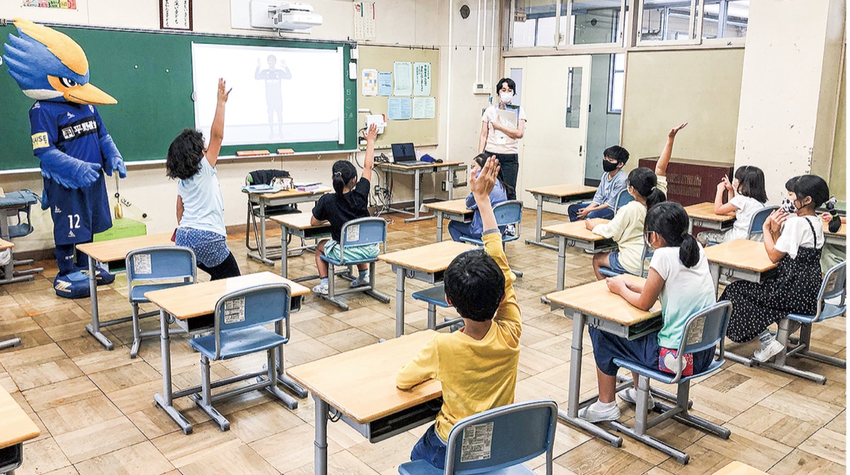 7月2日にはゼルビーが三輪小学校の放課後英語教室を訪問。子どもたちと一緒に動画を見ながら講師のレッスンを受けた。佐野海舟選手が登場し、名前、ポジション、好きな色や食べ物などを身振りを交えて英語で話すと子どもたちは画面にくぎ付けに。その後、講師が内容についてクイズ形式で当てさせるなど、クラスはアットホームな雰囲気に包まれた。教室に参加した4年生の女子児童は「動画の内容が面白くて、楽しかった」と笑顔で感想を述べた。