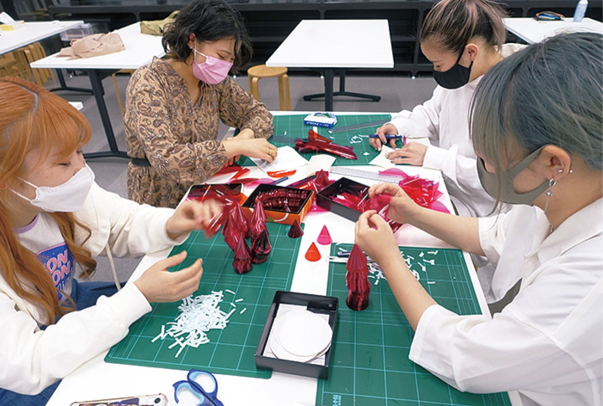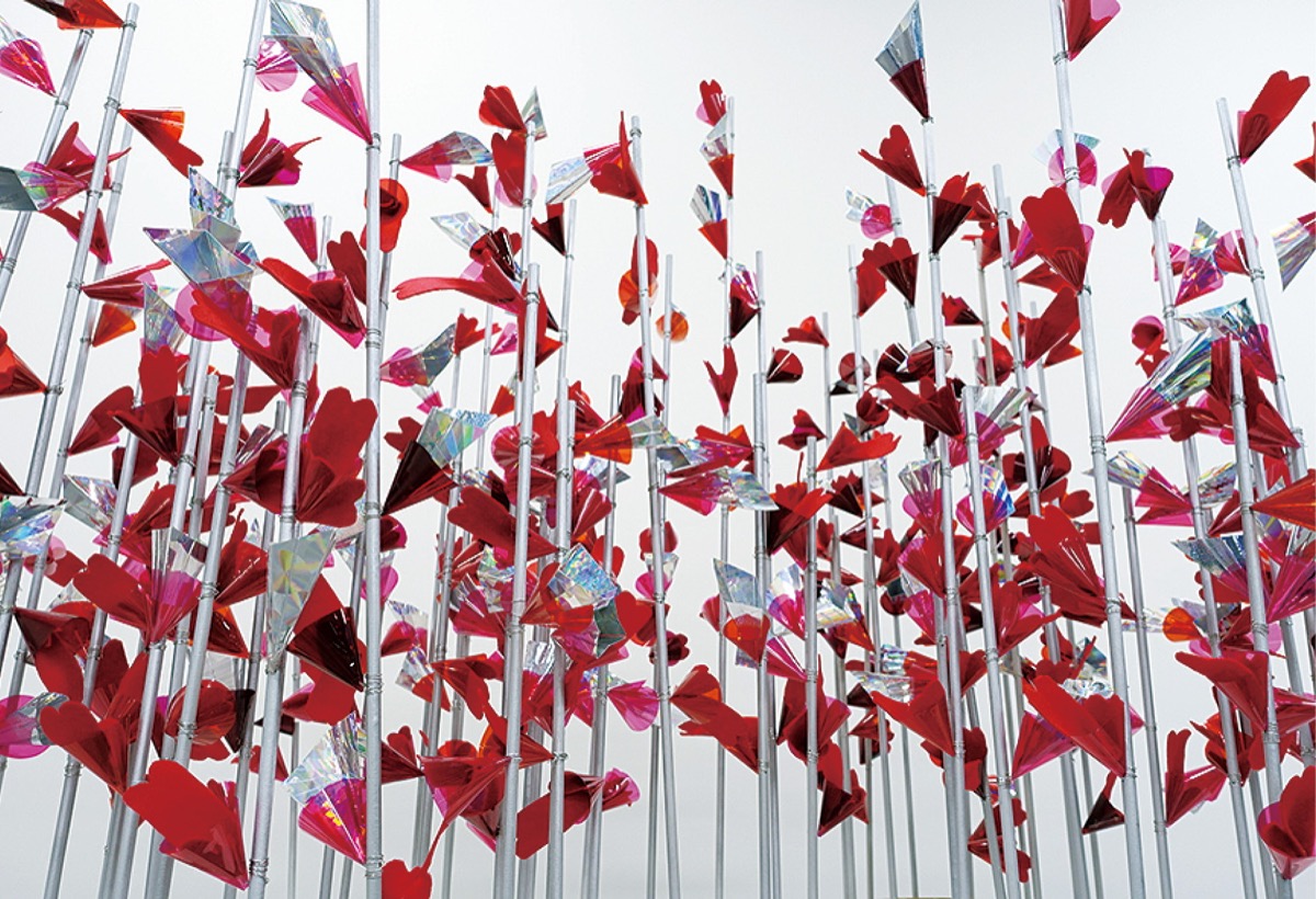 ディスプレーは桜美林大学芸術文化学群(田中敬一教授)が市からの依頼を受けて空間デザインを行ったもの。学生らが市を駆け抜けるランナーにちなみ町田市の花・サルビアをモチーフに赤い炎を造形化(=上写真)。熱い想いのこもったバトンを渡していく様子をハート形のレイアウトで表現し、人々の心へ繋ぐことへの願いをメッセージに込めて制作したが、聖火リレーの公道走行が中止となり、発表の機会が失われていた。「市民の目に触れることなく終わらずに良かった。実現しなかった公道での聖火リレーや走者たちに想いを馳せて頂ければ」と田中教授。