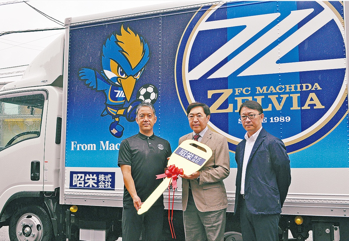 サッカーJ2リーグ、FC町田ゼルビアのオフィシャルパートナーである昭栄株式会社(原町田・三橋永治代表取締役)が同クラブのアカデミー(小・中・高校生部門)に道具等の運搬用のトラックを贈呈した。9月3日にはゼルビアキッチン駐車場で贈呈式が行われ、ゼルビアのロゴマークがあしらわれた2tトラックが引き渡された。