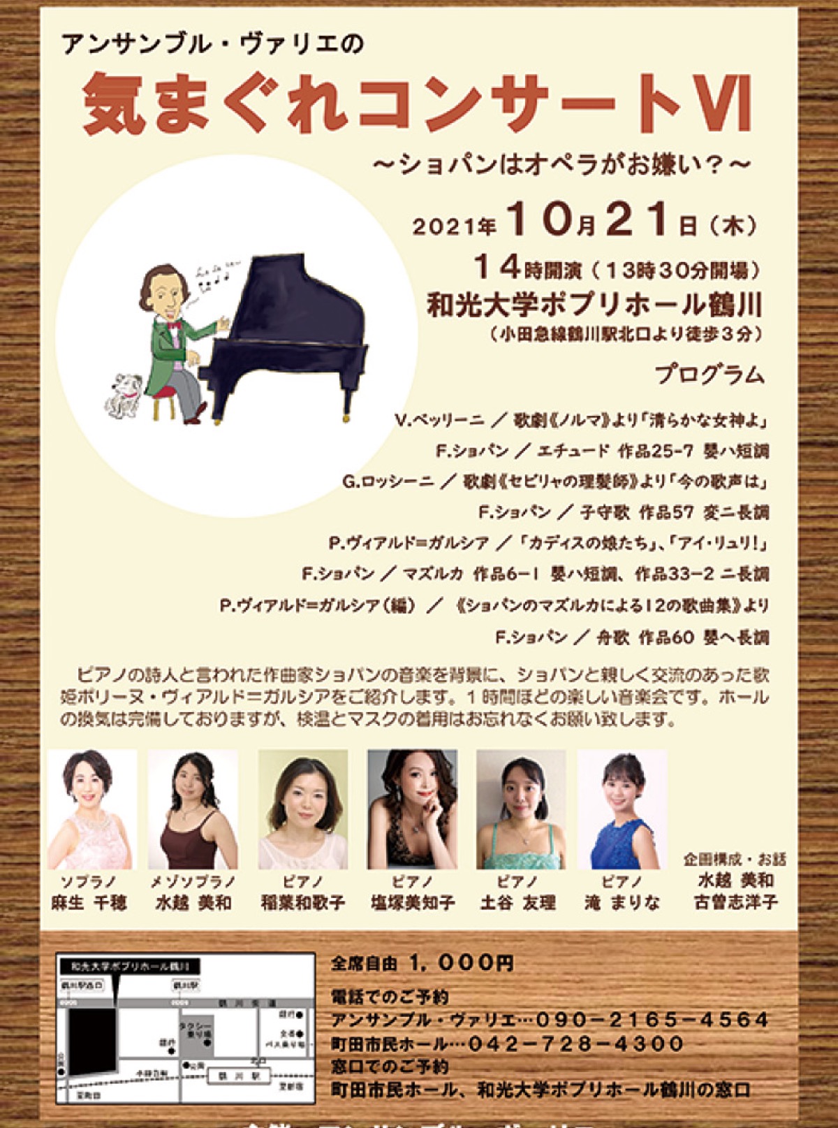 出演は麻生千穂(ソプラノ)、水越美和(メゾソプラノ)、稲葉和歌子、塩塚美知子、土谷友理、滝まりな(いずれもピアノ)。企画構成と話しは水越美和と古曽志洋子が務める。演目は歌劇ノルマより「清らかな女神よ」(ベッリーニ)、エチュード作品25-7嬰ハ短調(ショパン)、子守歌作品57変ニ長調(ショパン)、「カディスの娘たち」(ヴィアルド=ガルシア)など10曲。「ショパンと親しく交流のあった歌姫ポリーヌ・ヴィアルド=ガルシアをご紹介。1時間ほどの楽しい音楽会です」と古曽志さん。換気等のコロナ対策は万全。マスク着用を。全席自由1000円。問合せ・申込みは【携帯電話】090・2165・4564古曽志さん
