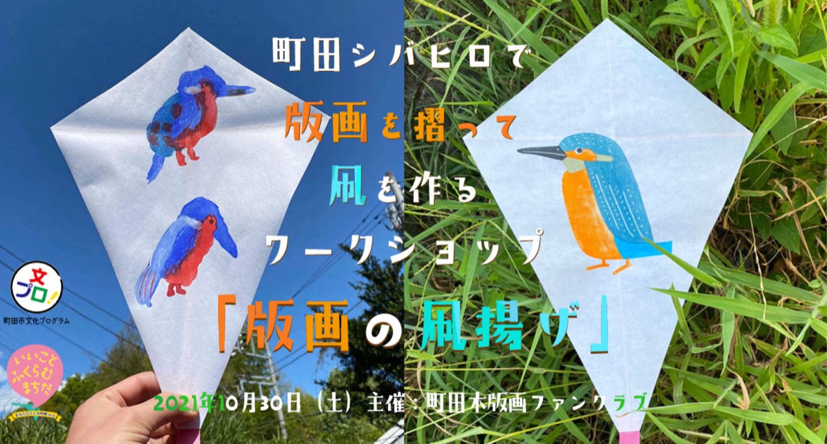 町田市の鳥「カワセミ」をモチーフにした版画を使った凧を作るワークショップで、2020年10月にも行われたイベント。当日は木版画の水性多色摺りを体験し、凧作りに挑戦。シバヒロで凧揚げという流れ。凧作りの完成まで約30分。