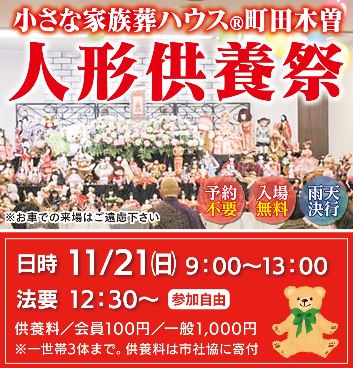(株)永田屋(本社/相模原市緑区橋本)は『人形供養祭&家族みんなで楽しめる大抽選会』を11月21日(日)、午前9時から午後1時まで、「小さな家族葬ハウス町田木曽」で開催する。入場無料で予約不要、雨天決行。