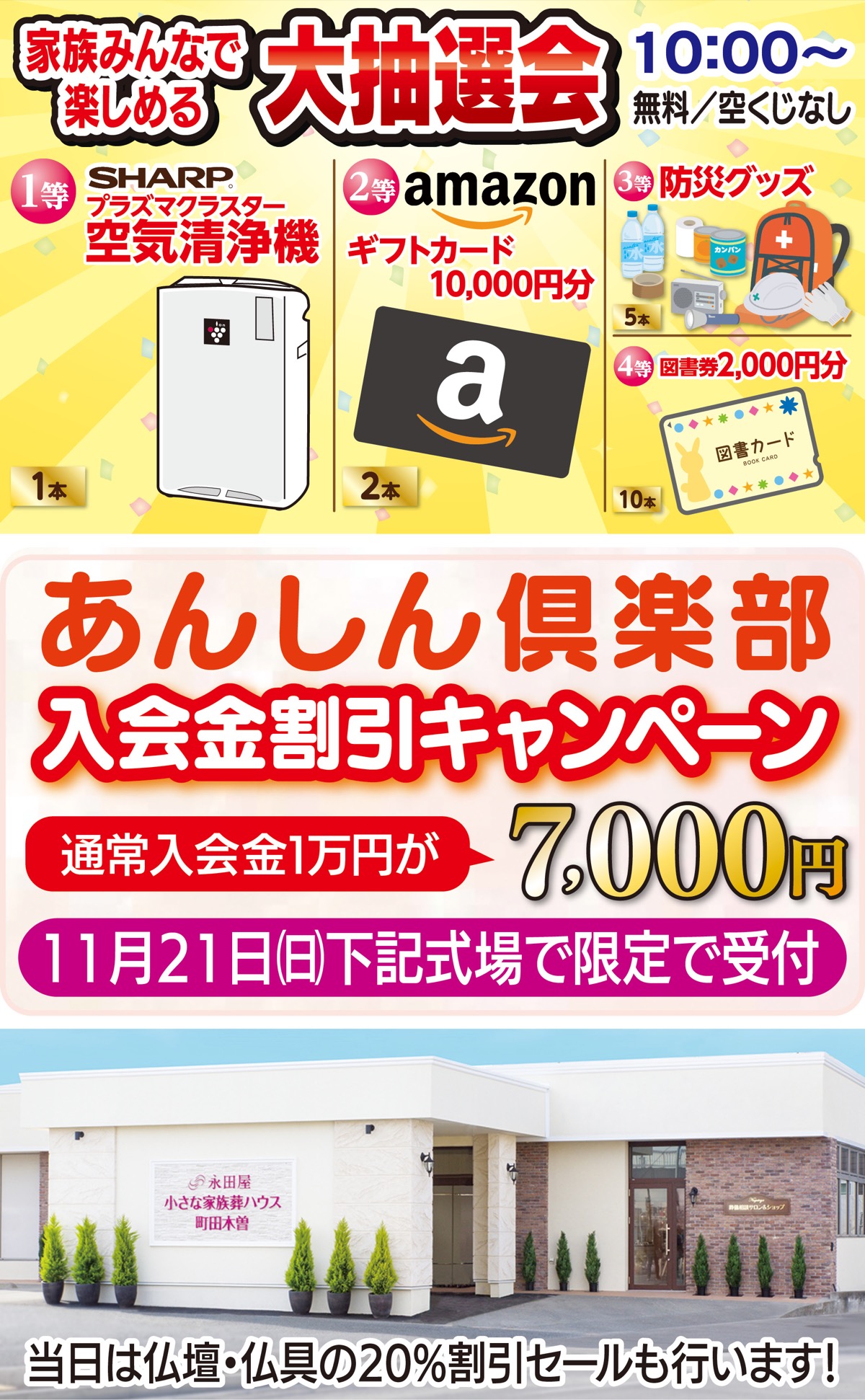 もしもの時に精神的、経済的不安を軽減する「あんしん倶楽部」には8万人を超える方が加入。年会費・積立金は一切不要で、式場使用料50%割引、葬儀基本コース20%割引や遺言・相続・永代供養など終活の様々な特典を受けられる。11日(日)の開催時間内に来場、手続き(入会は17時まで)された人対象で、入会金10000円が7000円になるお得なキャンペーンを実施する。