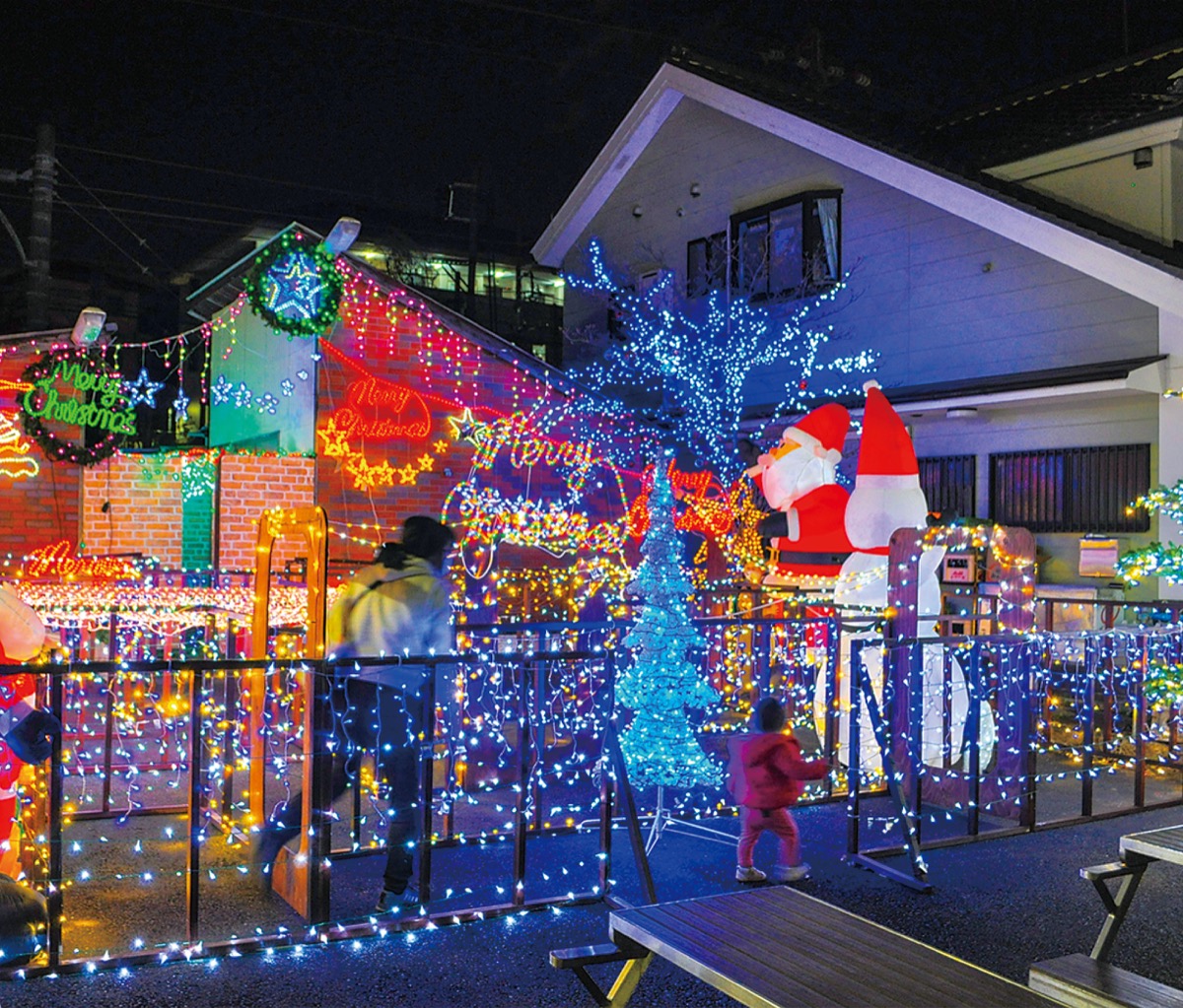 小田急線玉川学園前駅北口の玉川学園商店会の沿道約600mに渡り、街路灯約50本、街路樹約40本が年末まで煌びやかな電球で彩られる。中ほどのポケットパークにはクリスマスイルミネーションで飾られた「光の迷路」が登場し、道行く人々を楽しませている。同商店会の渡辺誠一会長は「昨年はコロナ下で人を集めてはいけないと小規模なものしかできなかった。商店会から街に活気を与えたいと、今年は豪華なものにした。迷路は会員の一級建築士が図面を書いて作った本格的なもの。楽しんでもらえたら嬉しい」と話す。