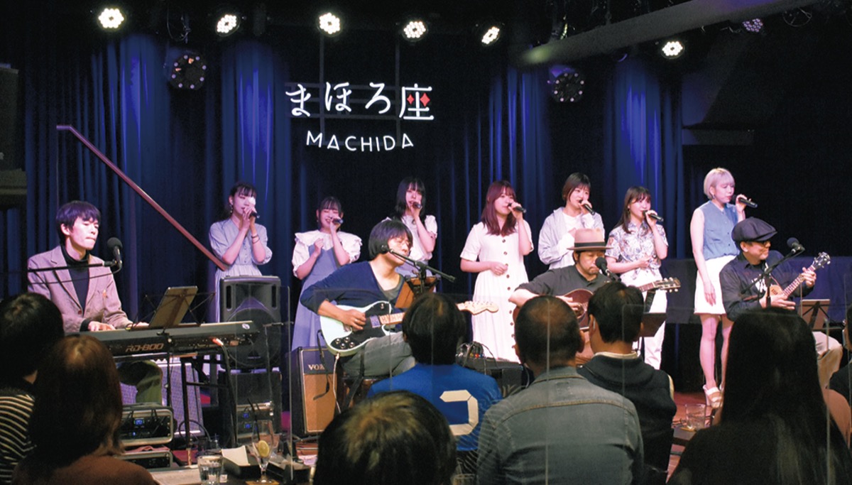 10―3'sは、町田ガールズクワイアプロデューサーの石田ショーキチさんと佐々木良さんによるユニット。この日はシンガーソングライターの矢舟テツローさんや成瀬英樹さんも出演。サプライズとして町田ガールズクワイアも登場しチャリティー楽曲「支える手」のほか、矢舟さん作曲の「プラネタリウムのある町で」を披露した=写真。