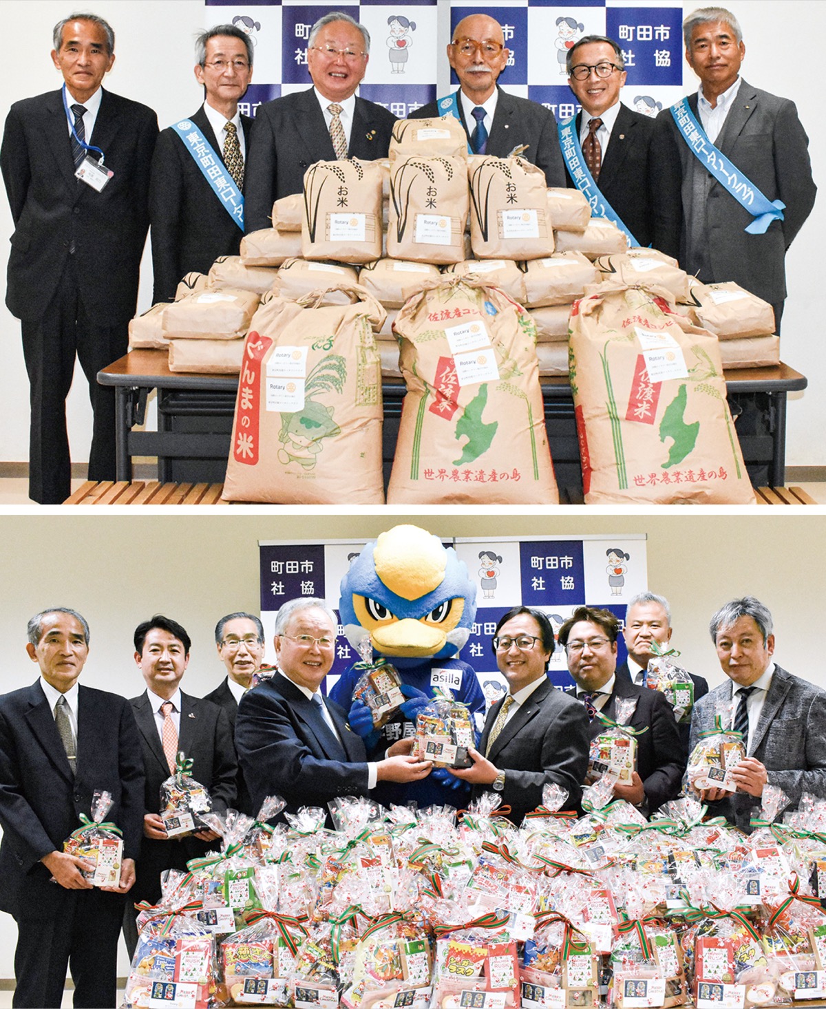 町田市のひとり親家庭支援事業「おうちでごはん」に今月、寄付が相次いだ。社会奉仕団体・東京町田東ロータリークラブは米を、東京町田サルビアロータリークラブは地元のお菓子セットをクリスマスプレゼントとして寄付。これらは市内69世帯の各家庭にボランティアの手により直接、届けられる。