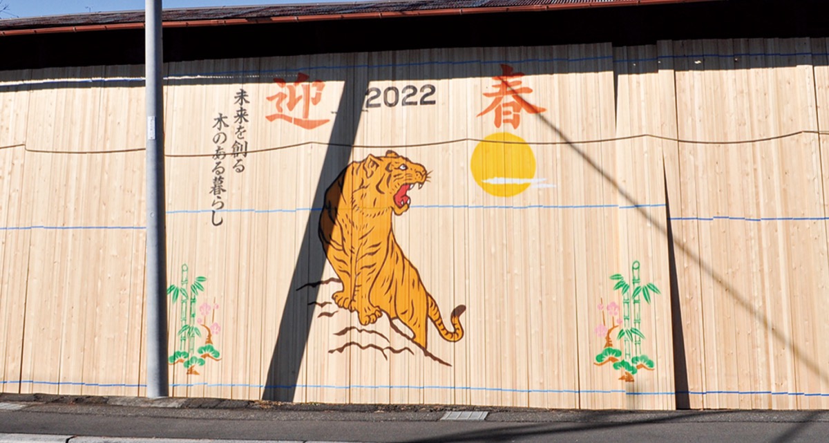 林場にただ木材を並べるだけでなく木造住宅の良さを知ってもらう目的で、業界で「飾り絵」が広がった。同社も20年以上、正月を祝う飾り絵として、毎年年末から年明けの1週間ほどの間、干支看板を飾り続けている。平本文彦社長は「近隣の人たちに期待されているようで、これからも続けていかないと」と話した。