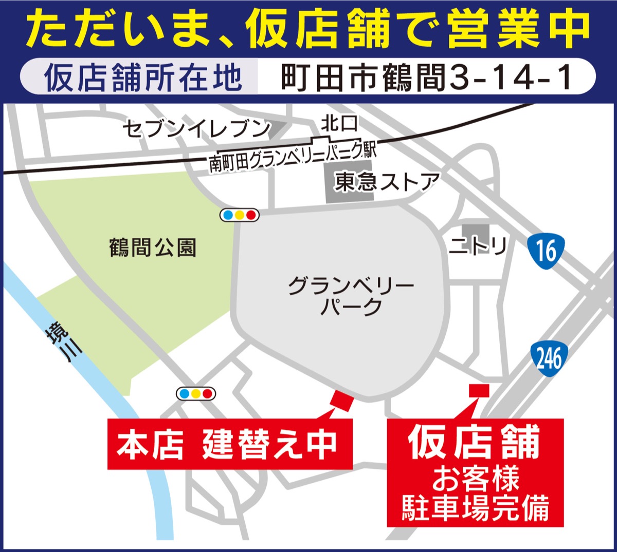 本社から200mほど東側、ケーズデンキ跡地にある仮店舗(鶴間3の14の1)で1月20日から営業中だ。