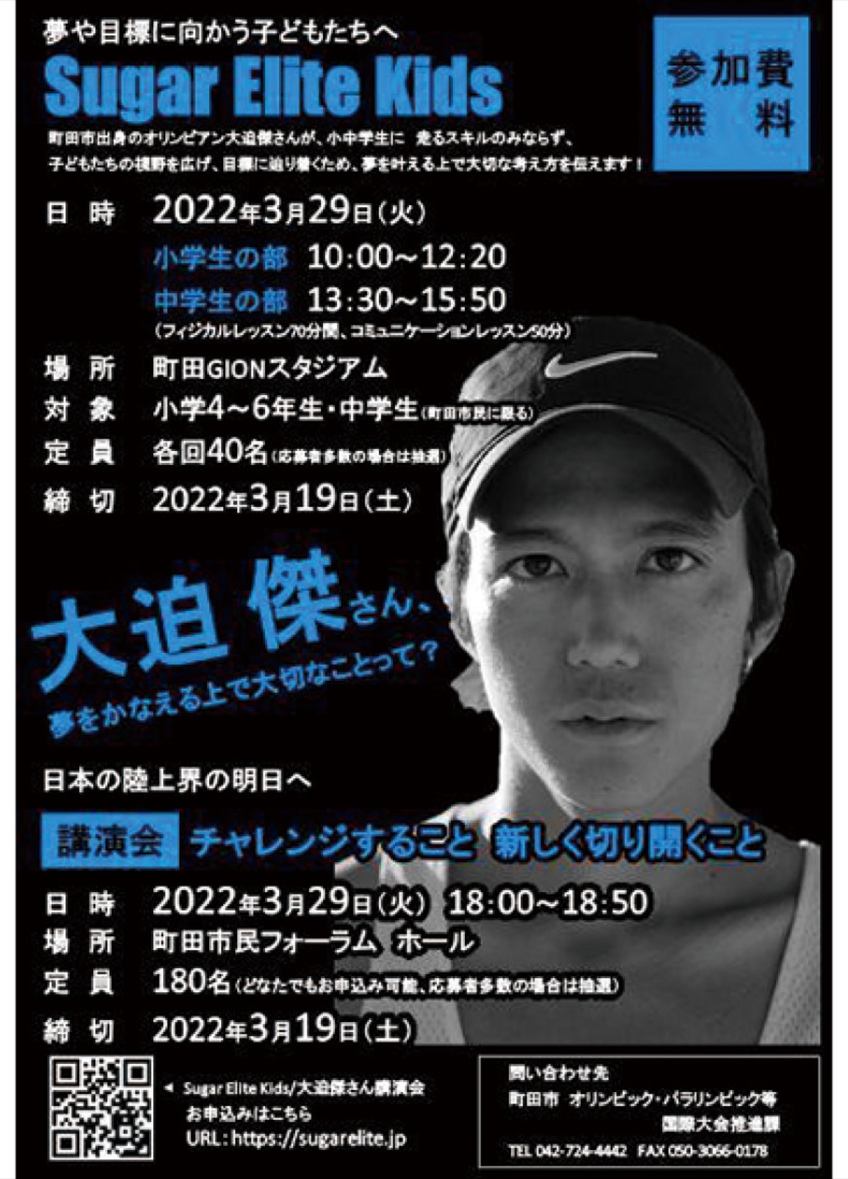 金井小、金井中出身、東京五輪男子マラソン6位入賞の大迫傑選手によるランニングキャラバン「Sugar Elite Kids」が3月29日(火)、町田GIONスタジアムで開かれる。午前10時〜12時20分(小4〜6)と午後1時30分〜3時50分(中学生)、各40人。実際に体を動かしながらのトレーニングやコミュニケーションレッスンなど、大迫選手の考えに基づく独自プログラムを通じ、子どもたちが直接指導を受ける。参加無料。特設サイトで要申込み。サイトは「シュガーエリートキッズ」で検索。