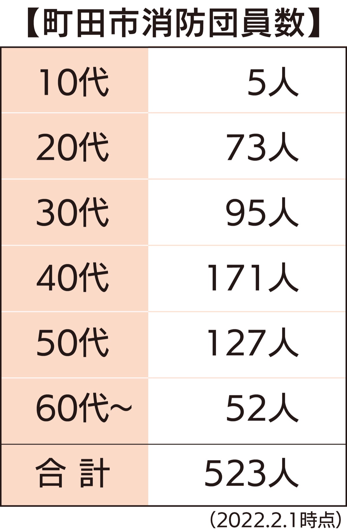 町田市消防団(吉川和男団長)は現在、条例定員660人に対し、523人が所属。うち女性は23人で、年代別では40代が一番多く、171人、次いで50代が127人と続く(2022年2月1日時点)。