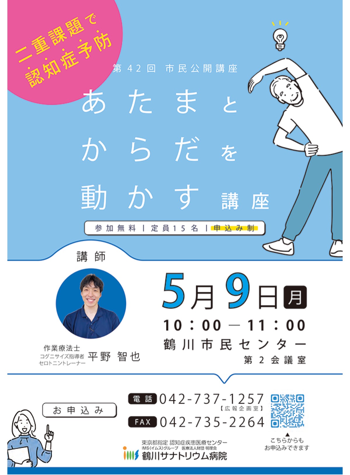 鶴川サナトリウム病院の第42回市民公開講座「あたまとからだを動かす講座」が5月9日(月)、鶴川市民センター第2会議室で開かれる。午前10時〜11時。
