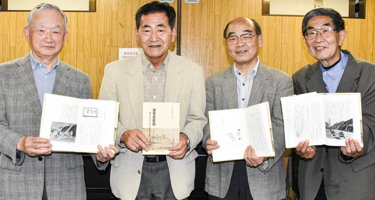 『博愛堂史話〜幕末名主日記に見る江戸近郊の世相』と題した書籍で、市内で発行されている地域情報紙「町田ジャーナル」に連載中の歴史コラム131回分をまとめたもの。著者は同館館長の小島政孝さん(写真中央左)をはじめ、重政文三郎さん(写真中央右)、辻清司さん(写真左端)、荒井仁さん(写真右端)、廣井理恵子さん、中井静雄さん、故・高場康禎さんの7人。