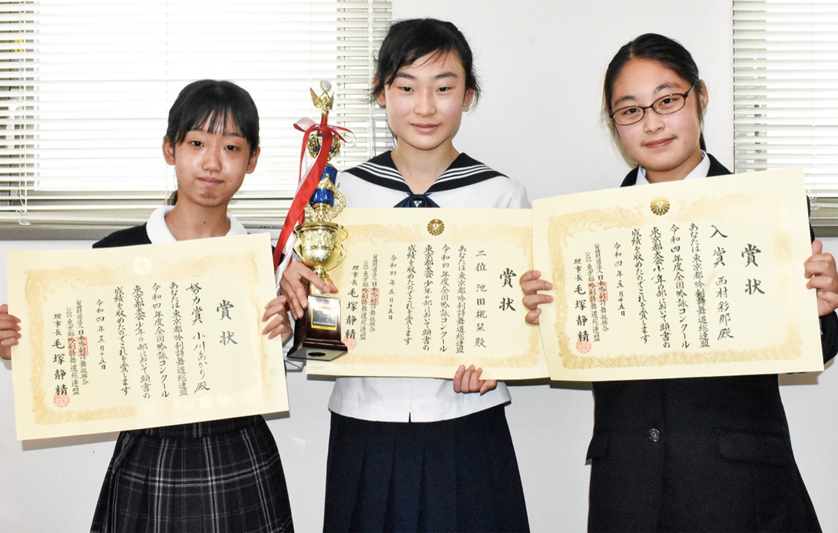 町田市吟詠連盟(川添吟照理事長)に所属する中学1年生3人が5月15日、品川区で行われた全国吟詠コンクール東京都大会に出場し入賞を果たした。19人が出場した少年の部で、池田桃栞さん(相模女子大学中学部)が2位、西村彩那さん(成瀬台中)が7位、小川あかりさん(忠生中)が10位にそれぞれ輝いた。池田さんと西村さんの2人は7月3日(日)に行われる東日本地区大会に出場する。主催は東京都吟剣詩舞道総連盟。