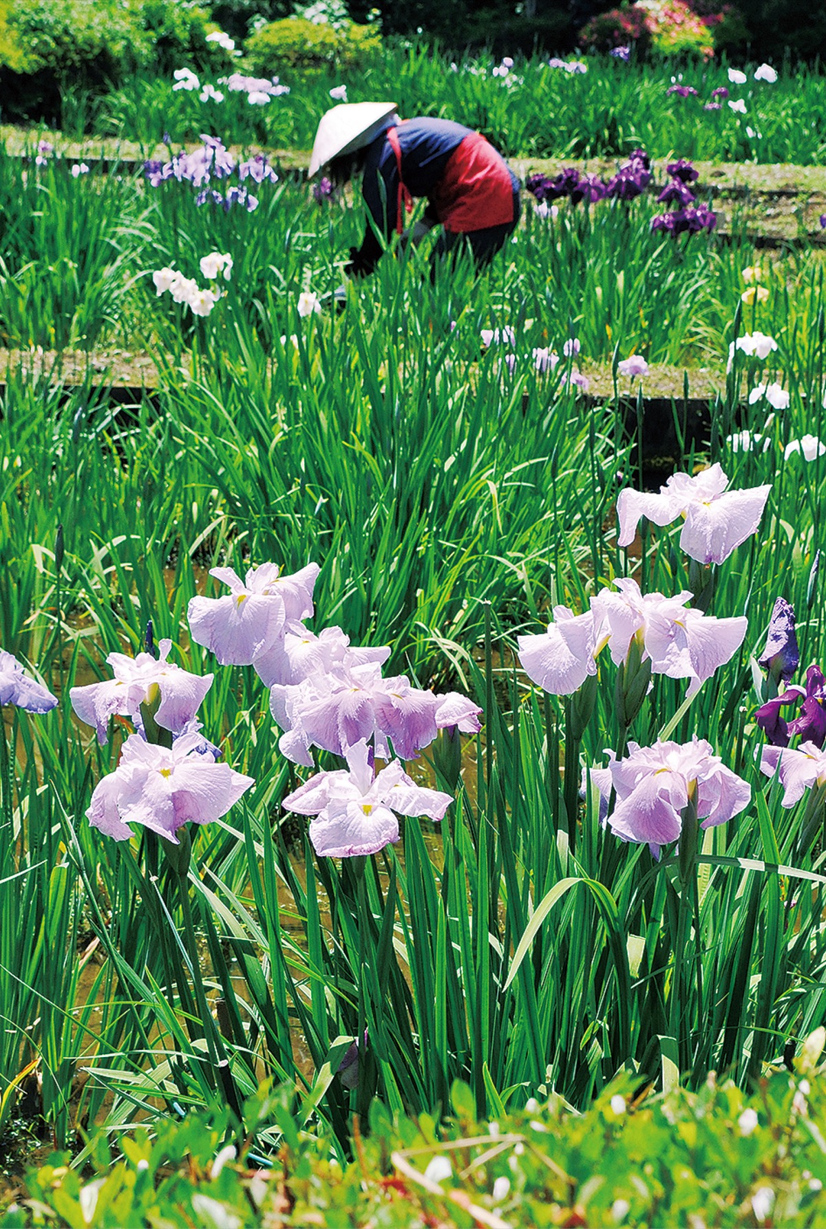 薬師池会場では、約230品種、2200株のショウブと、約1000株のアジサイ。訪れた人々は花を被写体に写真を撮影したり、花摘み娘を眺めたりして楽しんでいた。また、えびね苑会場でもアジサイが開花する期間限定で一部公開中。入園無料。