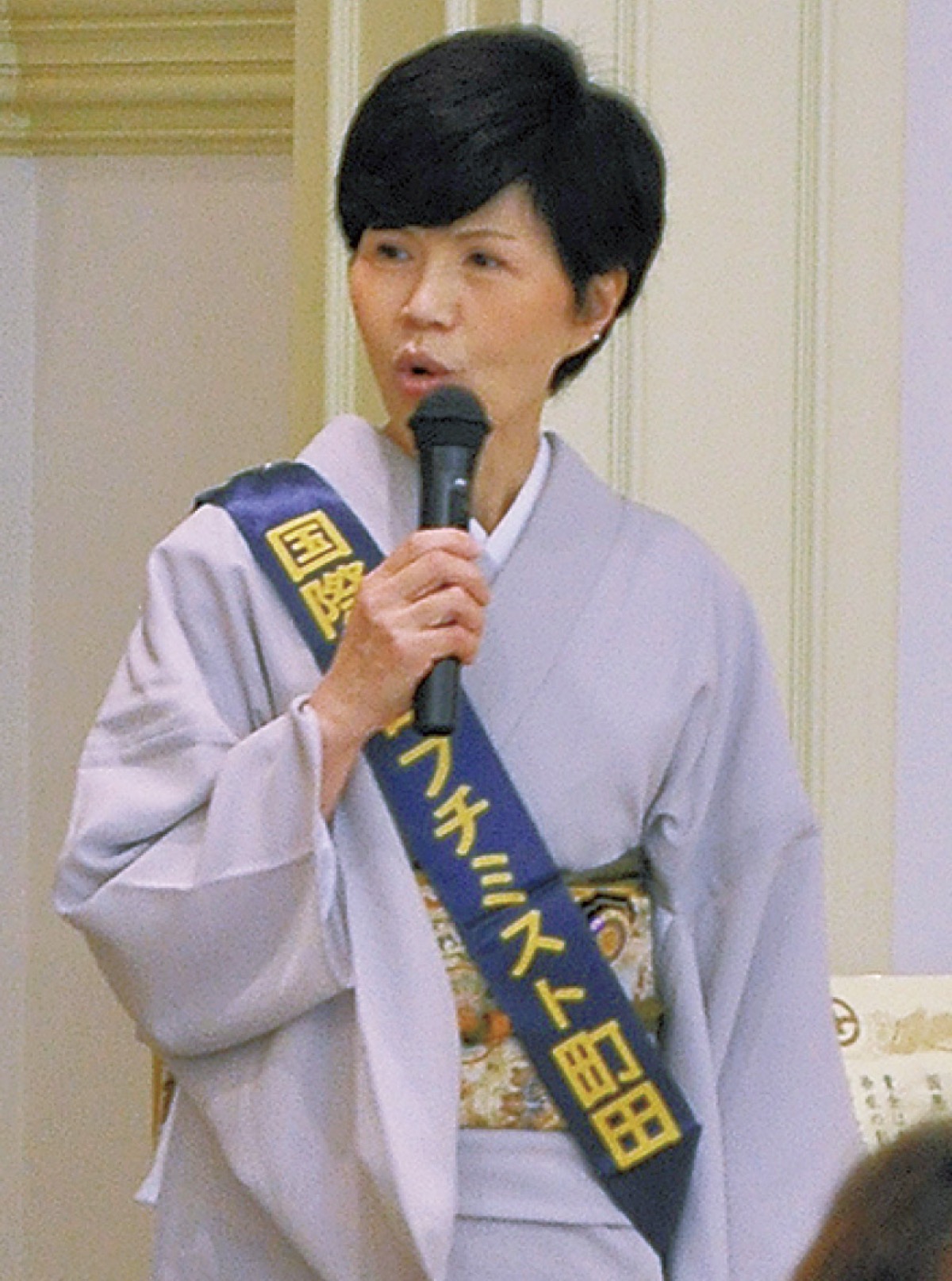 今年度、中学校のトイレに設置するための生理用品を市に寄贈した同クラブ。あいさつに立った柴崎会長は「私どもはこれまで地域や市と連携し、立場の弱い女性や女児の経済的支援を行ってきました。コロナ下で、自分のことを優先する人が増えている世の中で、こうしてこんなにも大勢の方が賛同してくれて、感謝いたします。この度の収益金も地域社会、国際社会支援のために使わせていただきます」と話した。