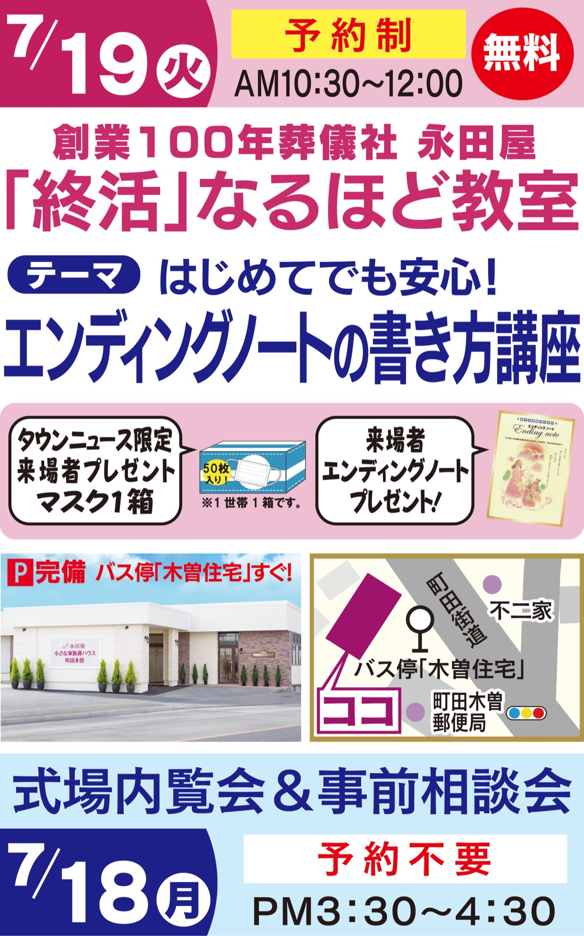 葬儀社・(株)永田屋の「終活」なるほど教室が7月19日(火)、小さな家族葬ハウスⓇ町田木曽で開かれる。参加無料。午前10時30分から正午。